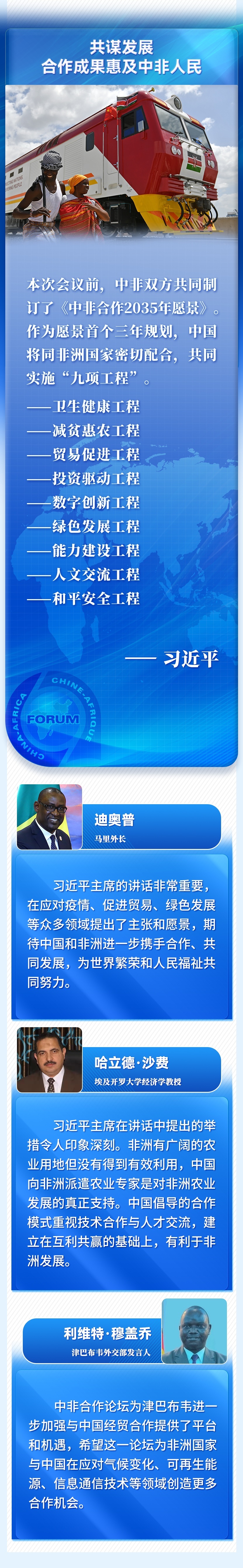 本次会议前,中非双方共同制订了《中非合作2035年愿景》。作为愿景首个三年规划,中国将同非洲国家密切配合,共同实施“九项工程”。