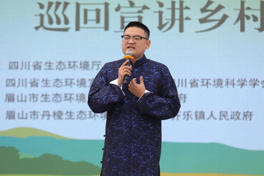12月3日,习近平生态文明思想巡回宣讲乡村行活动首站走进眉山市丹棱县齐乐镇。四川知名散打评书演员陈功在此次巡回宣讲活动中打破传统课件讲解,采用散打评书的表演形式,绘声绘色地演绎了身边的环保故事,为当地农民群众、乡村干部等上了一堂通俗易懂、深入浅出的习近平生态文明思想宣讲课。