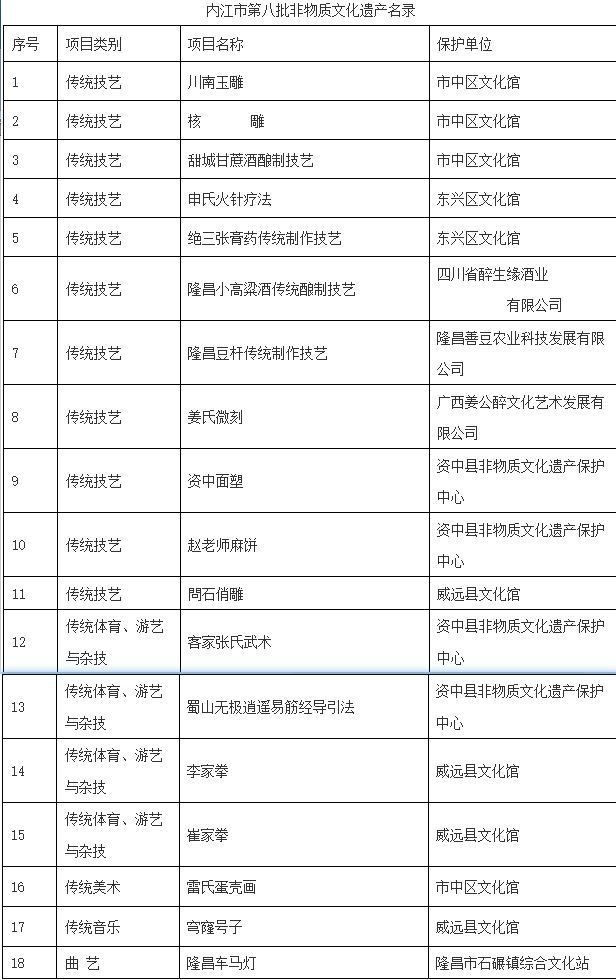 本批公布的项目有:传统技艺类“川南玉雕”“核雕”“甜城甘蔗酒酿制技艺”“申氏火针疗法”“绝三张膏药传统制作技艺”“隆昌小高粱酒传统酿制技艺”“隆昌豆杆传统制作技艺”“姜氏微刻”“资中面塑”“赵老师麻饼”“問石俏雕”;传统体育、游艺与杂技类“客家张氏武术”“蜀山无极逍遥易筋经导引法”“李家拳”“崔家拳”;传统美术类“雷氏蛋壳画”;传统音乐类“穹窿号子”;曲艺类“隆昌车马灯”等18项。