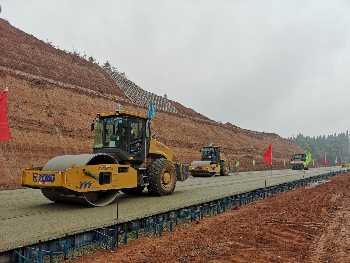 “突突突~~”3月17日,成资渝高速公路TJ7标路面分部二工区机器轰鸣,一台工程车不断铺筑砂石,身后,几台摊铺机并排开来,在砂石路面上来回碾压。