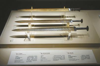 (上)越王勾践剑。(中)越王州勾错金铜剑。 (下)越王州勾剑。