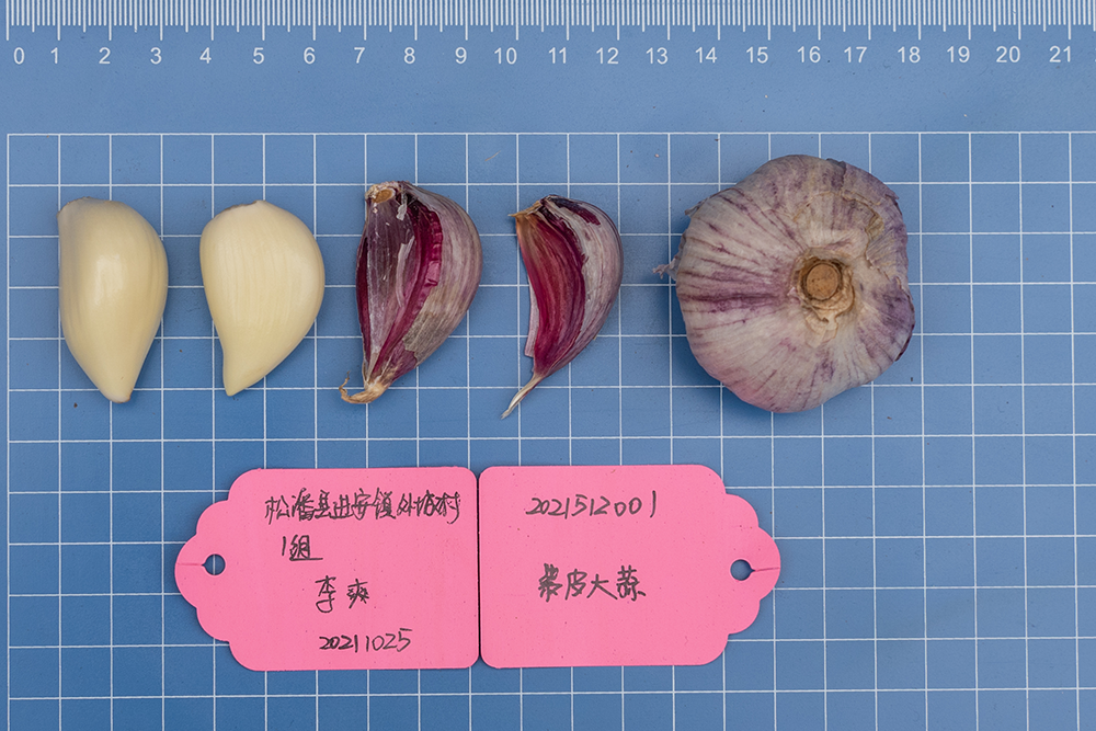 在第2调查队队长、省农科院经济作物育种栽培研究所所长叶鹏盛专业的眼光里,其中一种“紫皮大蒜”格外引人注目——相比于市面上的普通紫皮大蒜,两位老人家保留的这种紫皮大蒜个头大、紫色竖纹更加密集鲜艳。