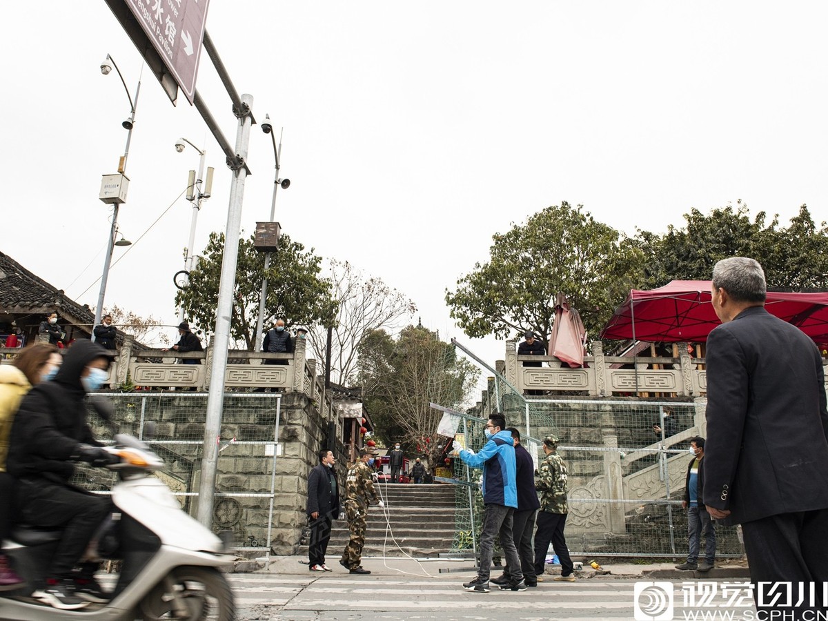 2020年3月16日,阆中古城,工作人员拆除华光楼码头入口处的封闭栅栏。