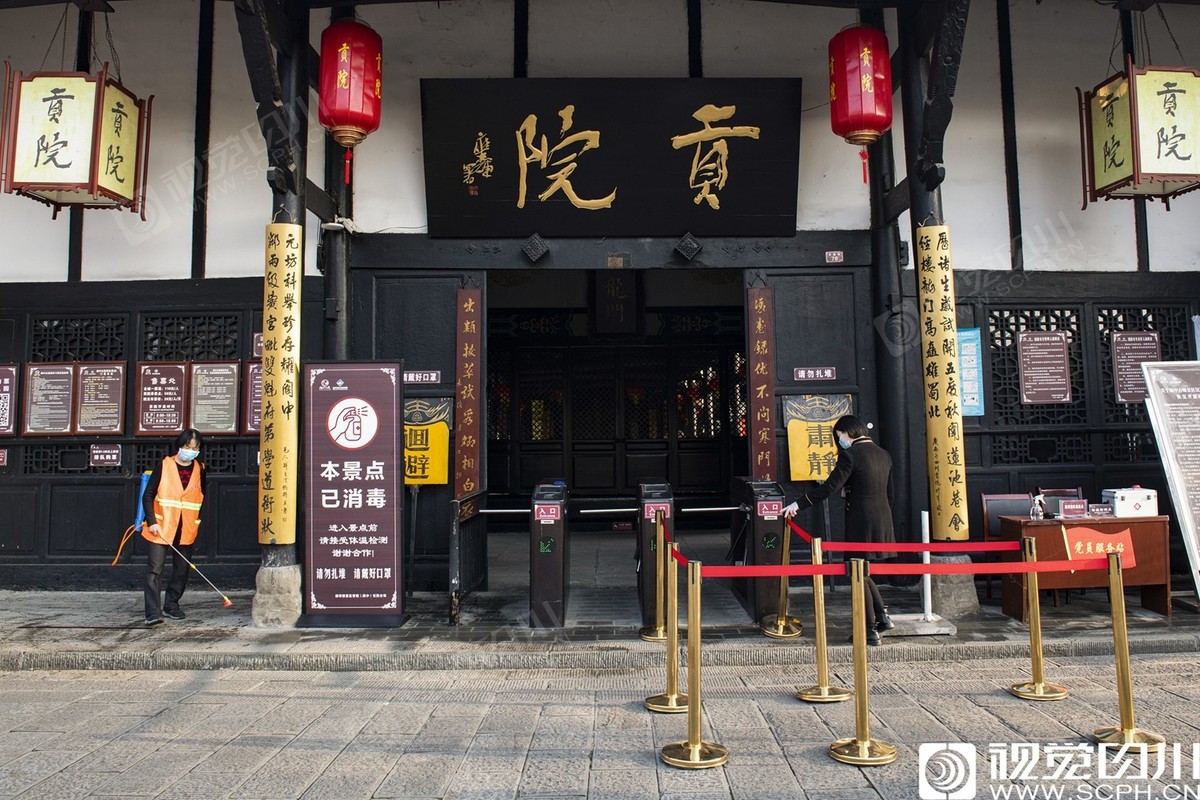 2020年3月18日,阆中古城,清代四川贡院工作人员为即将恢复开放的景点喷洒消毒药液。