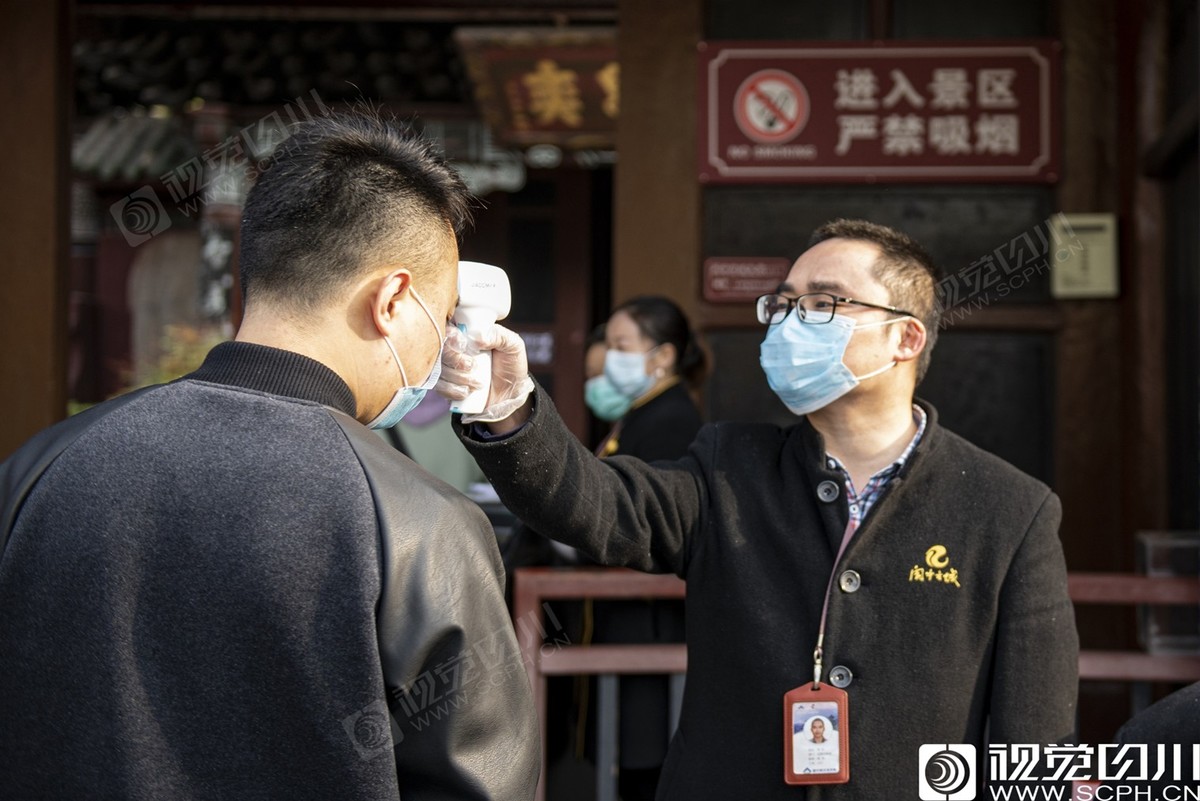 2020年3月18日,阆中古城,工作人员为将进入张飞庙景点的游客测量体温。