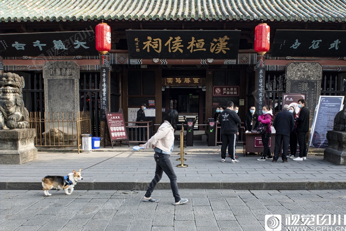 2020年3月18日,阆中古城,市民从恢复开放的张飞庙景点门前走过。