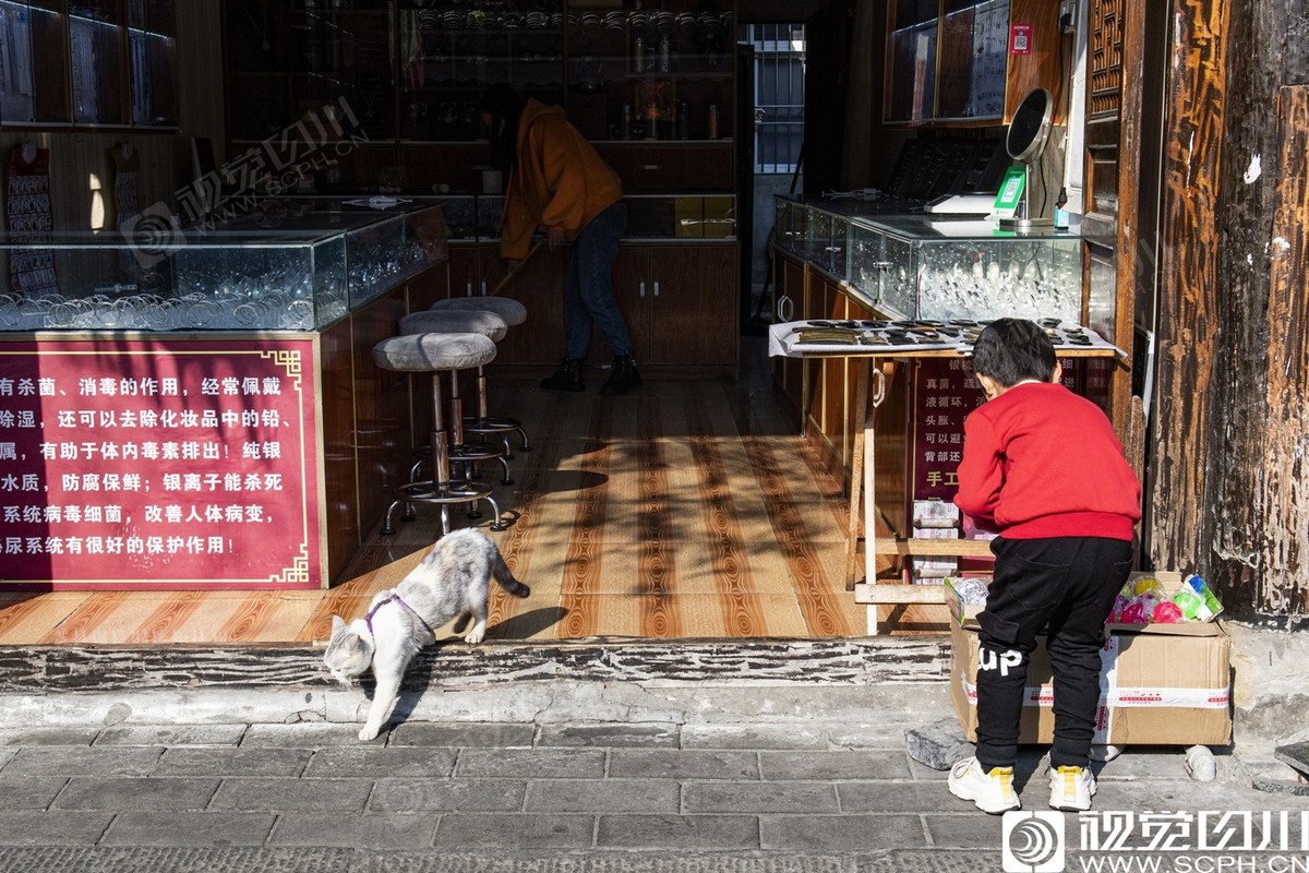 2020年3月18日,阆中古城,一名小朋友在恢复经营的店铺前玩耍。