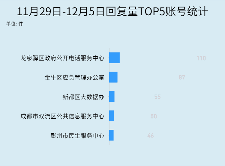 从具体接件转办单位来看,全川转办回复量排名上前五的单位分别为: