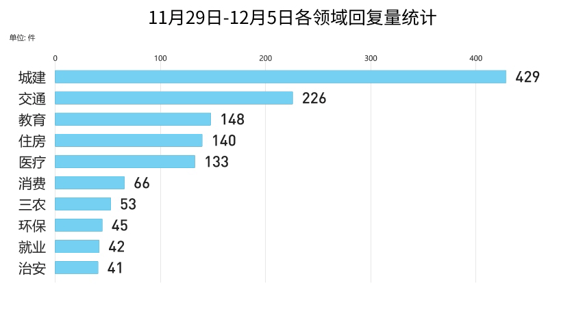截至12月5日零时,网民留言集中在城建、交通、教育三类问题上,三类回复量占总回复量的比例分别为37.63%、19.82%、12.98%。
