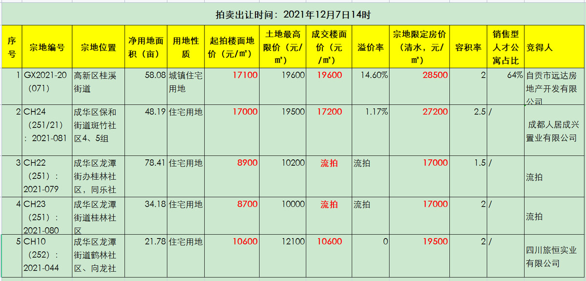 除了天府新区和高新区的宗地外,下午金牛区有2宗地出让,成华区4宗地出让。最终仅有金牛区西华街道与郫都区接壤的80亩纯住宅用地成交,由龙湖以楼面地价11500元/㎡底价拿下。另一宗位于天回镇街道的102.2亩地块意外流拍。成华区的4宗地里,龙潭街道的两宗面积分别为78.4亩和34.2亩地块流拍,其余2宗则分别以小幅溢价由人居竞得,以及由北京天恒底价竞得。