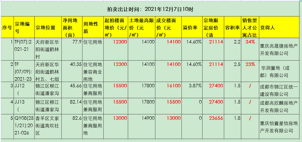 今日,天府新区的两宗地处锦江生态带的地块一开场便引起开发商争相举牌,最终第一宗77.9亩地块以14100元/㎡的宗地最高限价加34%的销售型一类人才公寓面积比例被拍下。另一宗40.35亩地块则被华润置地以14100元/㎡的拿下,并需配建23%的销售型一类人才公寓,而这也是华润置地首次进驻天府新区。