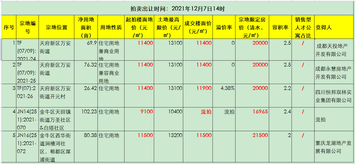今日下午14点拍卖继续,共有10宗土地出让,但最终仅有7宗成交,3宗土地流拍。相比上午天府新区锦江生态带地块的火热,下午天府新区万安街道的三宗地则相对平静,两宗地块以底价楼面价11400元/㎡成交,一宗地块小幅溢价以楼面价11900元/㎡被恒邦双林拿下。