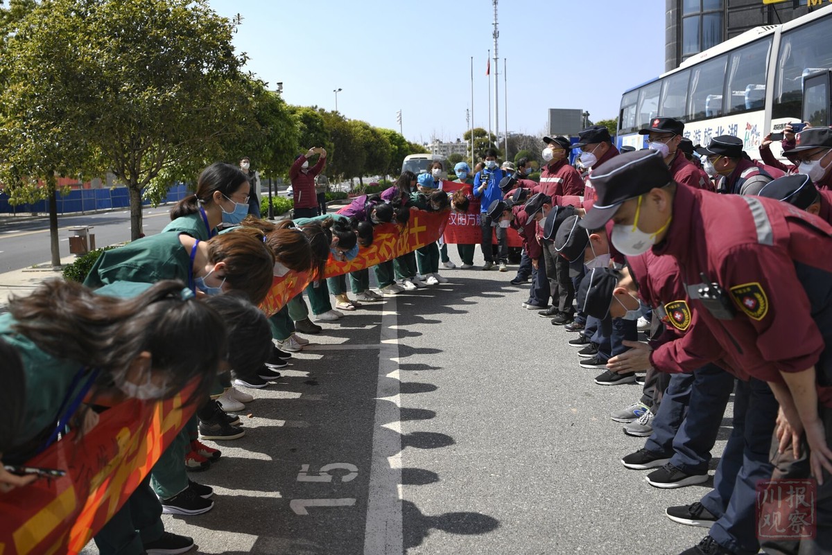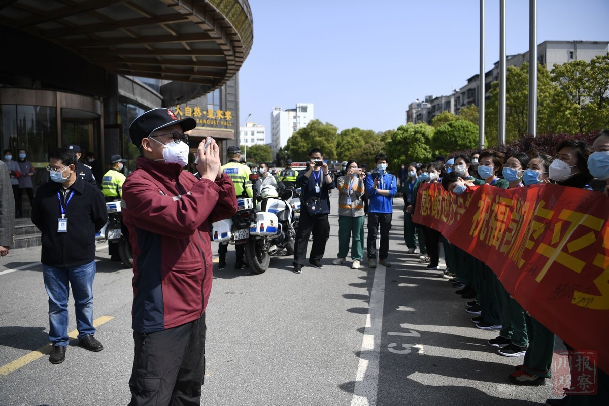 上午10时30分,四川省第四批援助湖北医疗队43名队员从驻地出发,受到了湖北省妇幼保健院医护人员、酒店工作人员和当地警察至高的欢送礼遇。