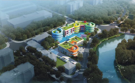 丹棱县第二幼儿园位于丹棱县齐乐镇滨江路,规划占地11亩,建筑面积5107平方米,设计规模15个班,450个学位,总投资1868万元。幼儿园立面造型讲述四只调皮的小瓢虫掉入四个不同颜色的颜料桶当中被染成不一样的颜色,体现整个建筑的童趣感与趣味性。