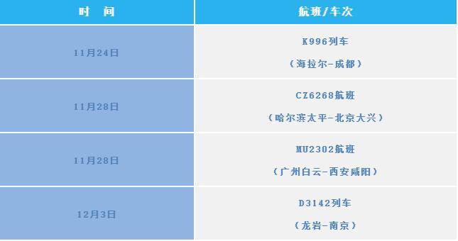 搭乘过以下交通工具的来(返)川人员,第一时间主动向社区或居(村)委会、单位或入住酒店报备旅居史,配合做好相关防控工作。