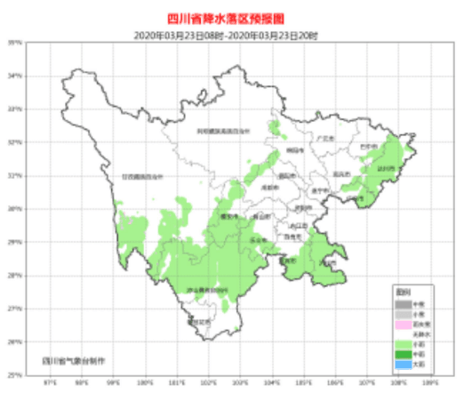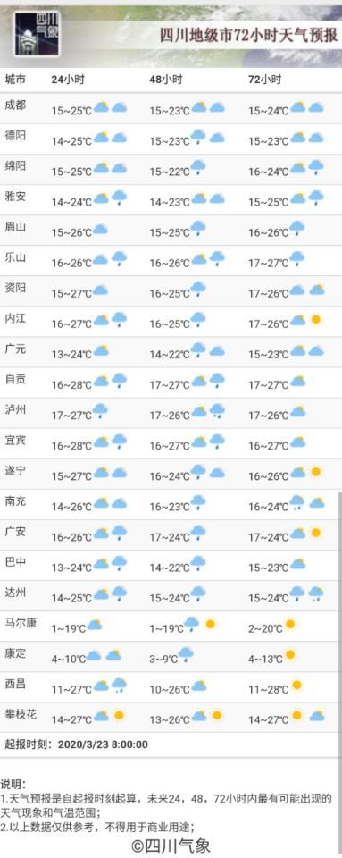 今天(3月23日)白天,达州、广安、泸州、雅安4市和乐山、宜宾2市南部及盆地西部沿山阴天间多云有分散阵雨,甘孜州南部和凉山州北部多云间阴天有分散阵雨(雪)。其余地方多云。
