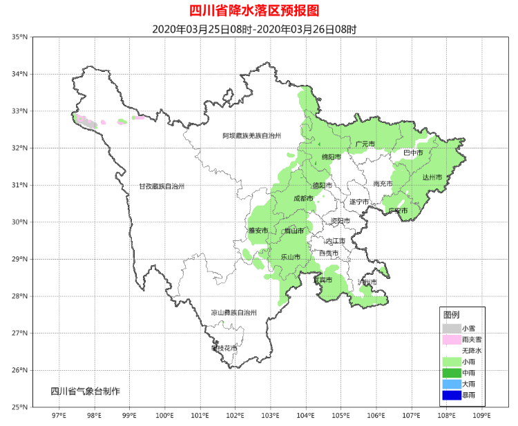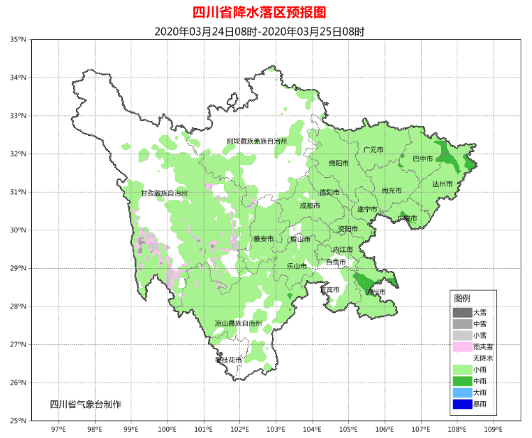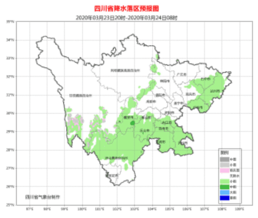 预计24日白天到晚上,盆地各市阴天间多云,大部地方有阵雨;甘孜州西北部、阿坝州北部和攀枝花市多云间晴,川西高原和攀西地区其余地方阴天间多云有阵雨(雪)。