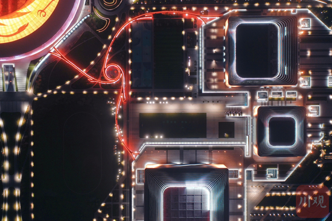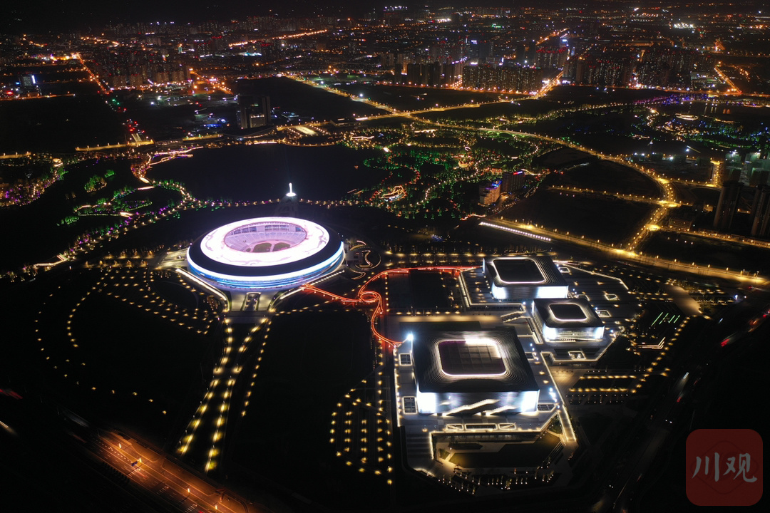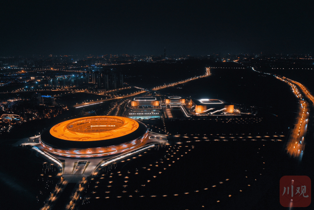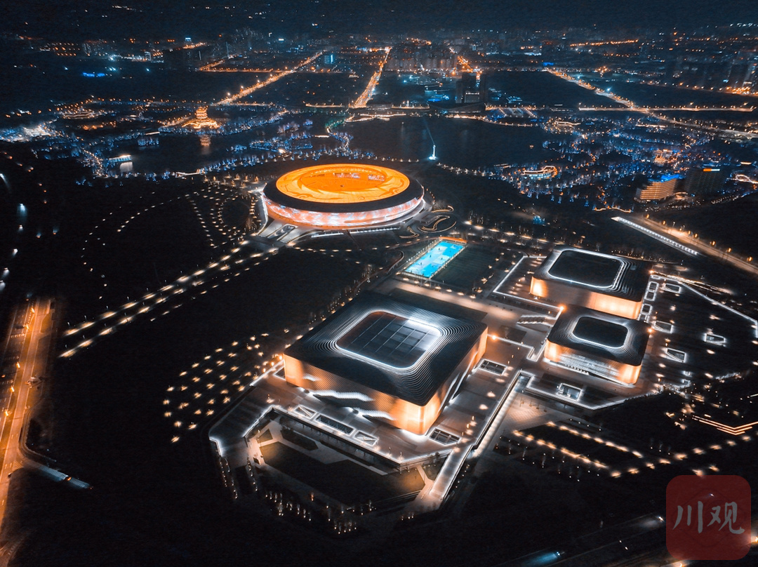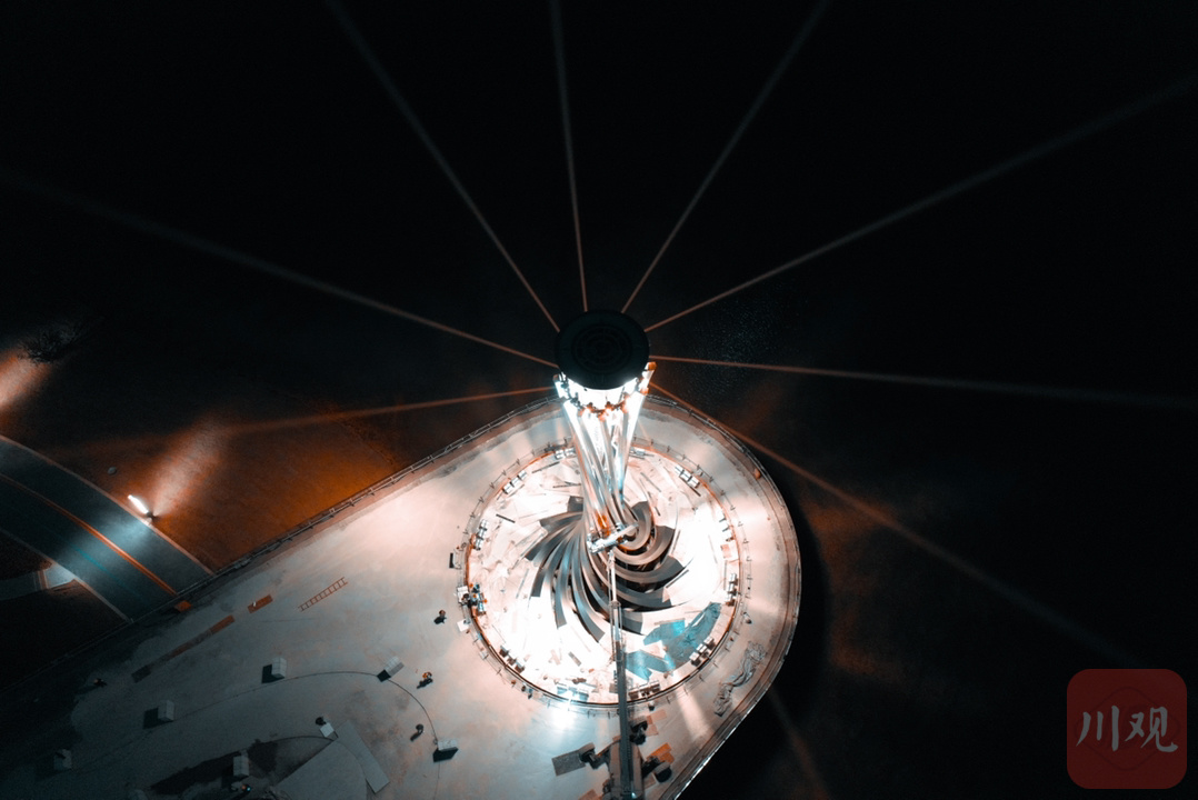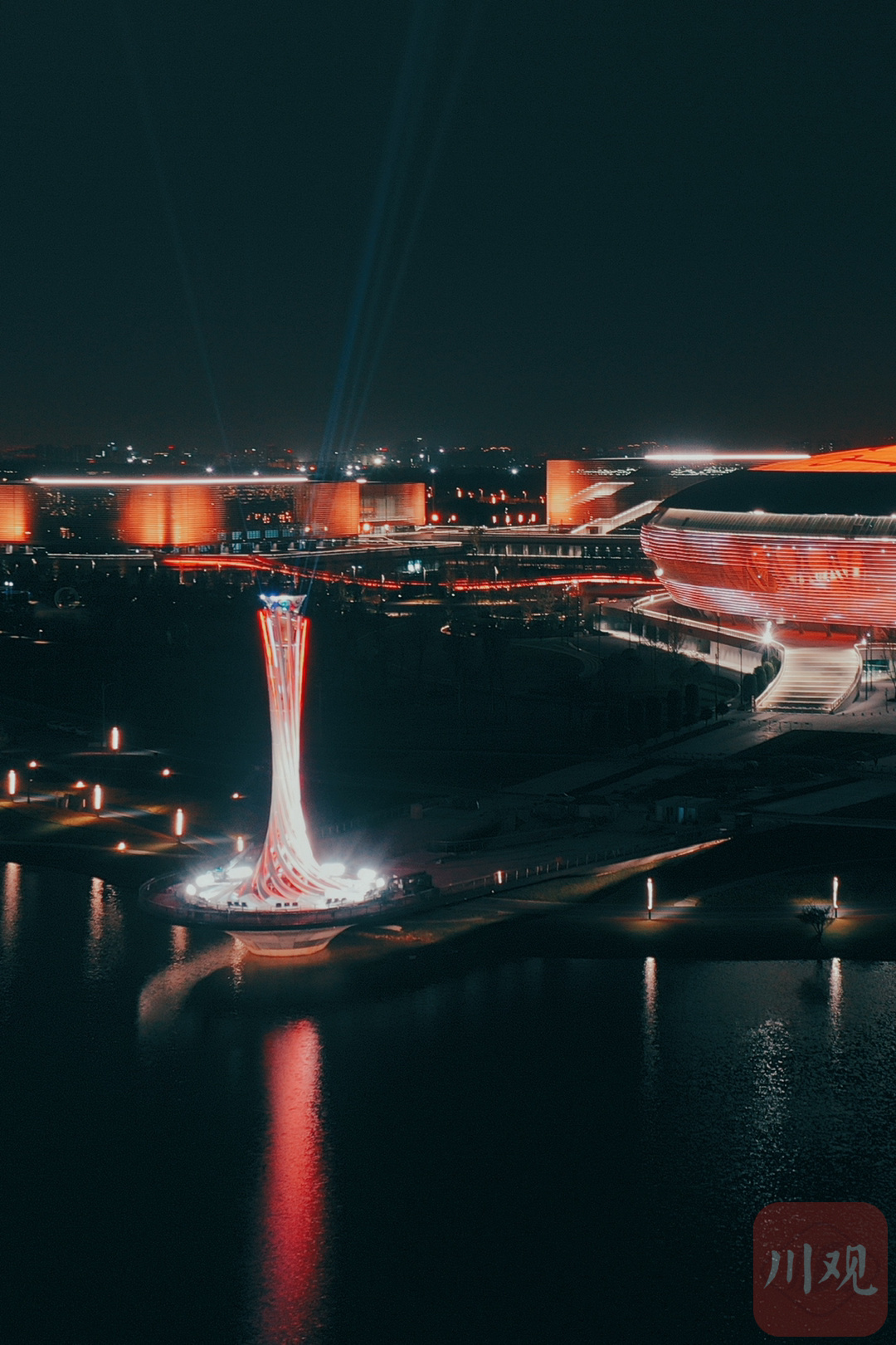 近日,东安湖体育公园主火炬塔“蓉火”进行了灯光测试,整个东安湖体育公园灯火辉煌。