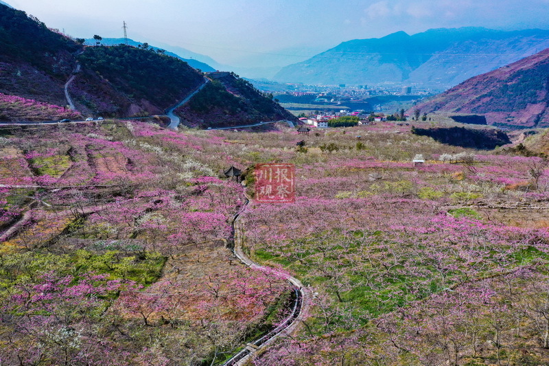 3月23日,在雅安市汉源县九襄镇申沟村,满山娇艳桃花被春风唤醒,在青山绿水中开得灿若云霞,美不胜收。