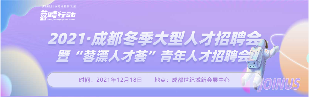 点击“阅读原文”,进入成都人才网“2021·成都冬季大型人才招聘会暨‘蓉漂人才荟’青年人才招聘会”专题查看。