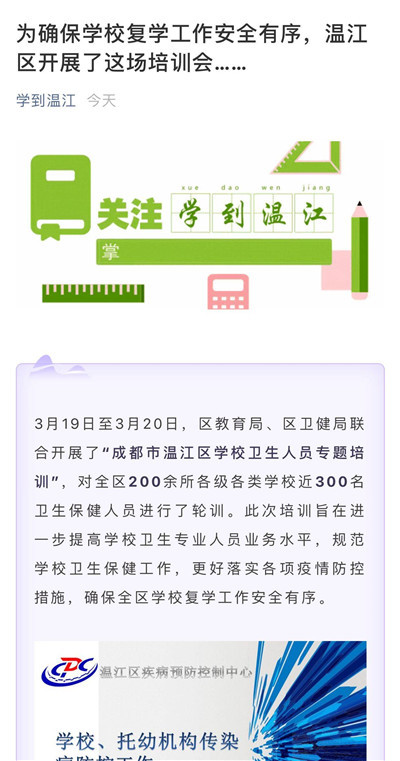 消息称:“3月19日至3月20日,区教育局、区卫健局联合开展了“成都市温江区学校卫生人员专题培训”,对全区200余所各级各类学校近300名卫生保健人员进行了轮训。此次培训旨在进一步提高学校卫生专业人员业务水平,规范学校卫生保健工作,更好落实各项疫情防控措施,确保全区学校复学工作安全有序。”