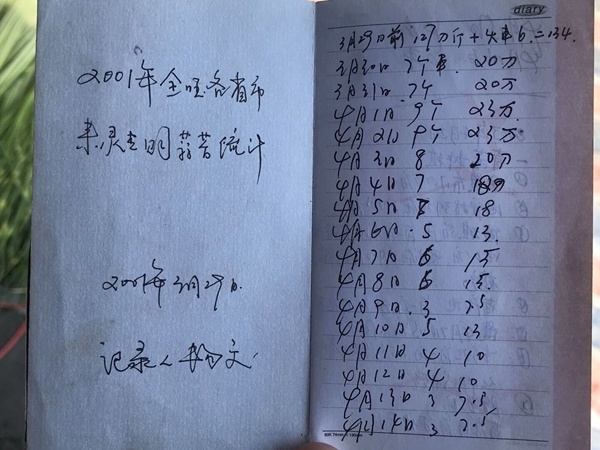 今年59岁的杨文,从2001年起便将洛水镇每年的蒜薹收购价记录在册,如今已有整整3个账本。2001年,当地蒜薹收购价才几毛钱一斤,作为当时镇农业办的一员,杨文决定把这一数据记录下来,供来年的蒜薹种植参考。