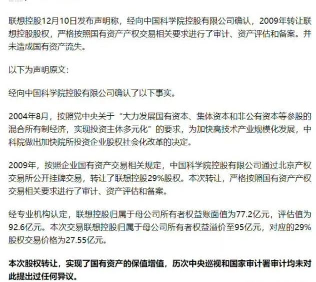 众所周知,近期以来,司马南针对联想公司发起了6期视频,视频内容指出联想公司是否存在资不抵债、造成国有资产流失等问题,引发了轩然大波。其中,司马南公开质疑联想2009年将29%股权转让给泛海集团,“涉嫌国有资产流失”成为各方关注的焦点。12月10日,联想控股终于发声,针对这一问题进行了回应。以下为声明全文:我们经向中国科学院控股有限公司确认了以下事实:2004年8月,按照党中央关于“大力发展国有资本、集体资本和非公有资本等参股的混合所有制经济,实现投资主体多元化”的要求,为加快高技术产业规模化发展,中科院做出加快院所投资企业股权社会化改革的决定。2009年,按照企业国有资产交易相关规定,中国科学院控股有限公司通过北京产权交易所公开挂牌交易,转让联想控股29%股权。本次转让,严格按照国有资产产权交易相关要求进行了审计、资产评估和备案。联想控股表示,经专业机构认定,联想控股归属于母公司所有者权益账面值为77.2亿元,评估值为92.6亿元。本次交易联想控股归属于母公司所有者权益溢价至95亿元,对应的29%股权交易价格为27.55亿元。联想控股声明显示,本次股权转让,实现国有资产的保值增值,历次中央巡视和国家审计署审计均未对此提出过任何异议。