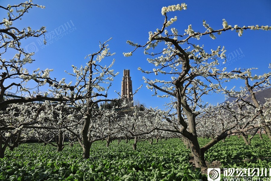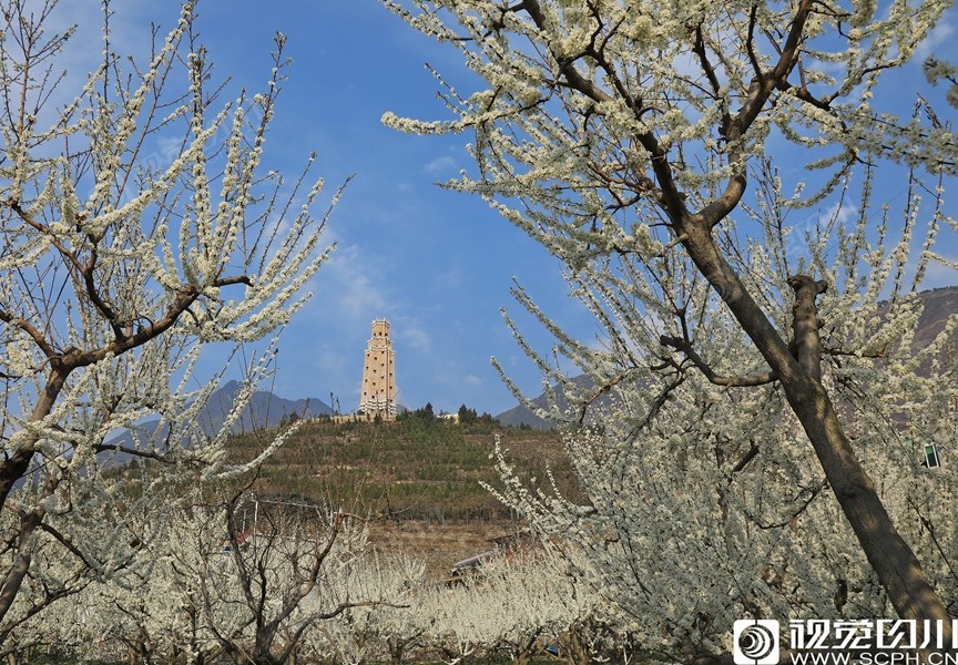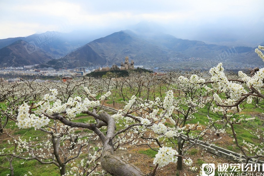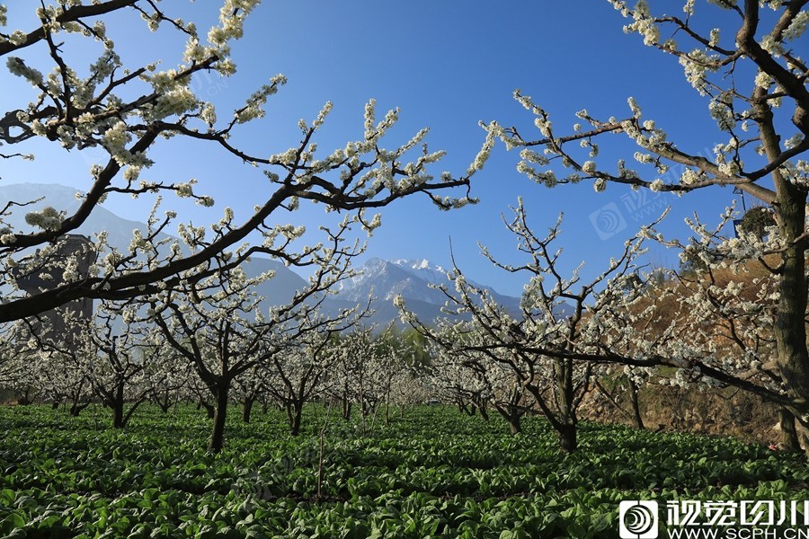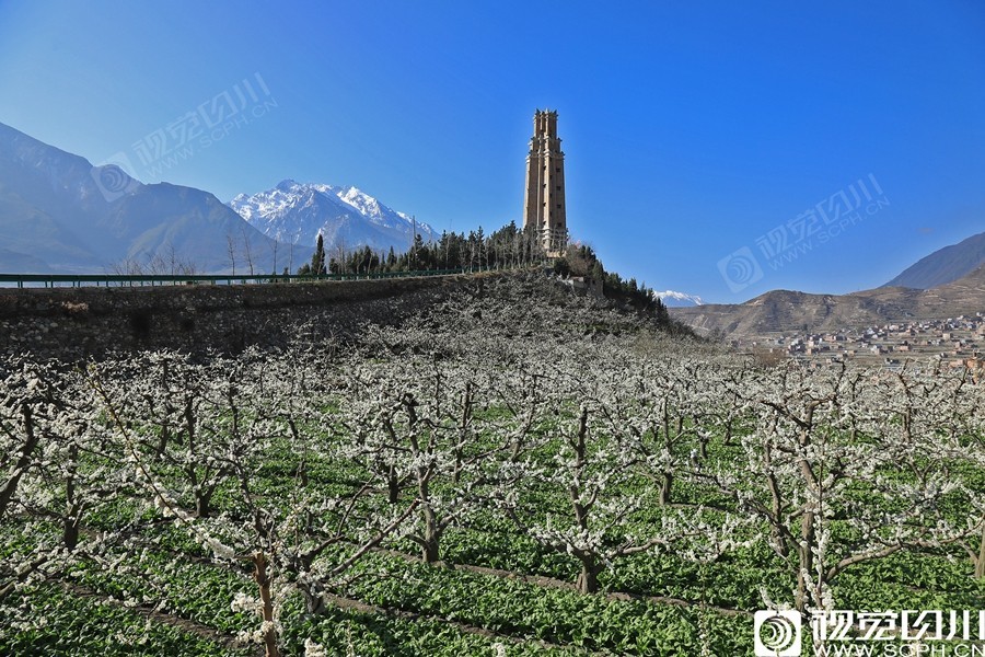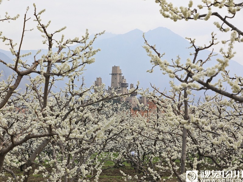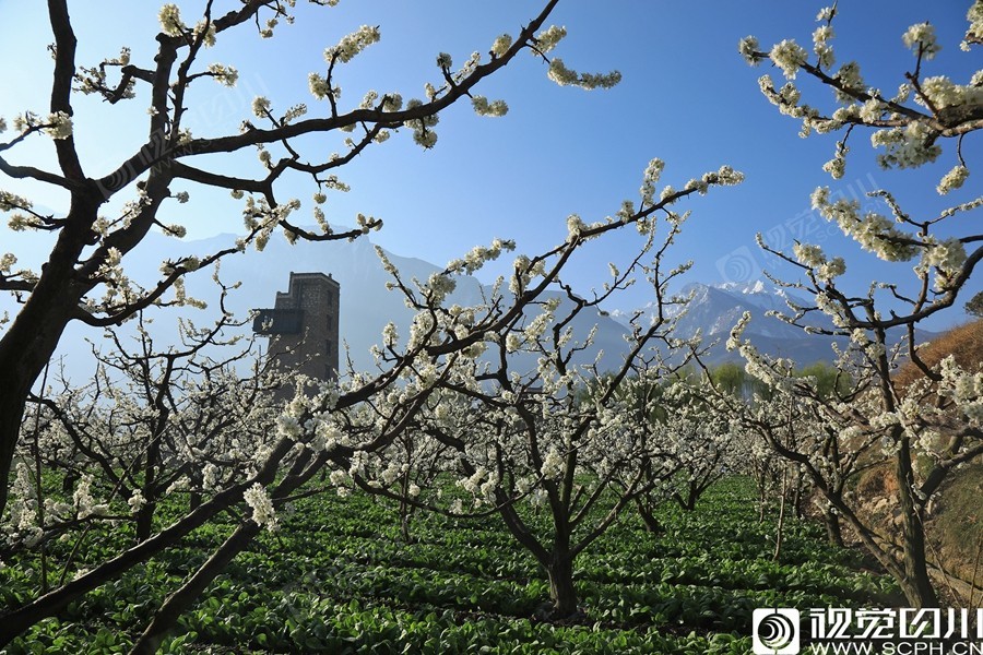 阳春三月,四川省茂县岷江河两岸万亩李树竞相开放,蓝天白云下的茂县,处处都成了花的海洋。一树树李花悄然绽放,素雅的李花缀满枝头,清风拂过,花香沁人心脾。李花树下,村民忙着劳作,成片的李花与独具特色的羌族碉楼及远方的雪山交相辉映,形成一道亮丽的风景线,犹如“童话世界”。