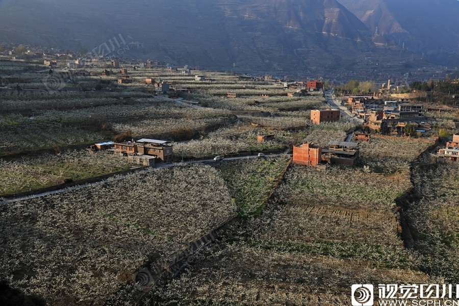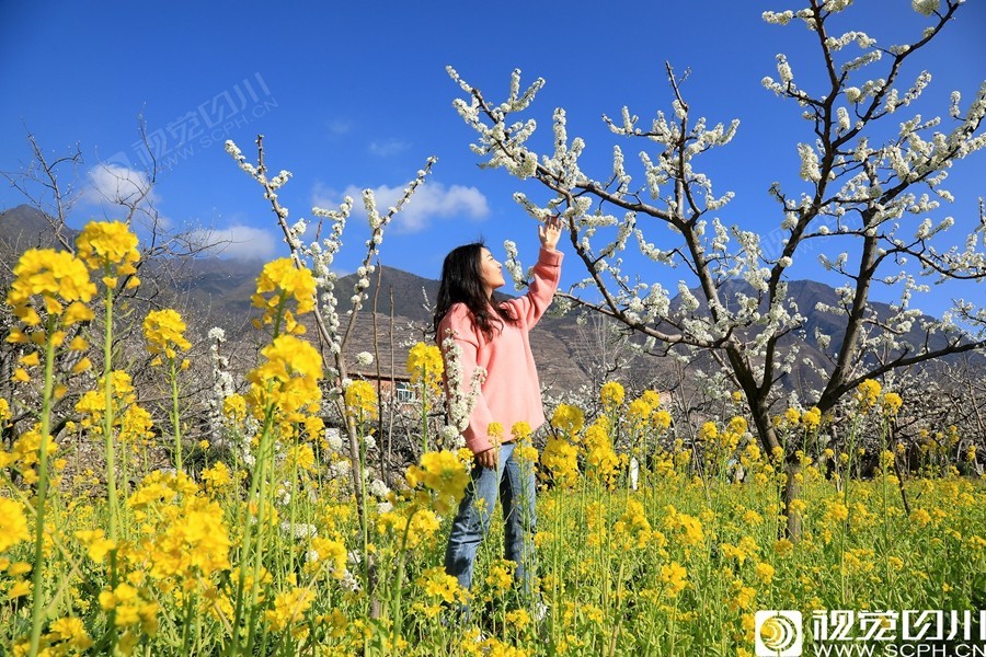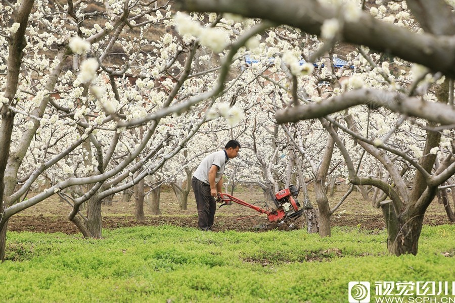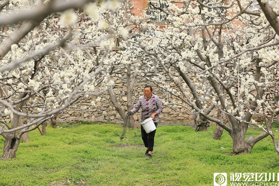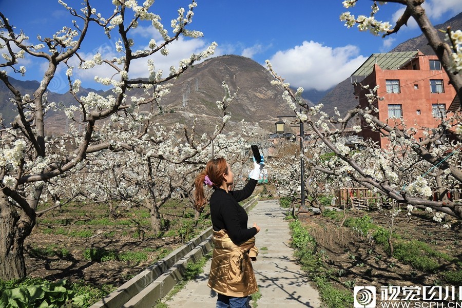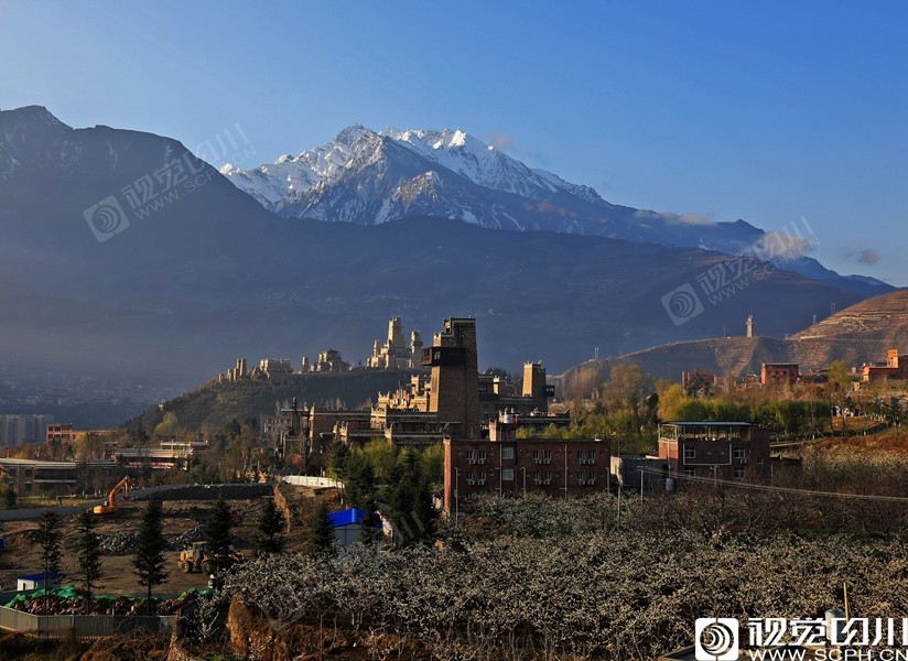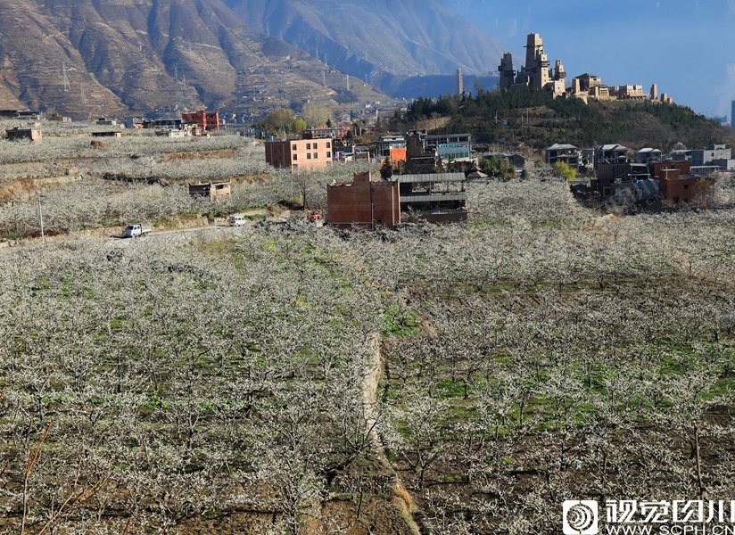 阳春三月,四川省茂县岷江河两岸万亩李树竞相开放,蓝天白云下的茂县,处处都成了花的海洋。一树树李花悄然绽放,素雅的李花缀满枝头,清风拂过,花香沁人心脾。李花树下,村民忙着劳作,成片的李花与独具特色的羌族碉楼及远方的雪山交相辉映,形成一道亮丽的风景线,犹如“童话世界”。