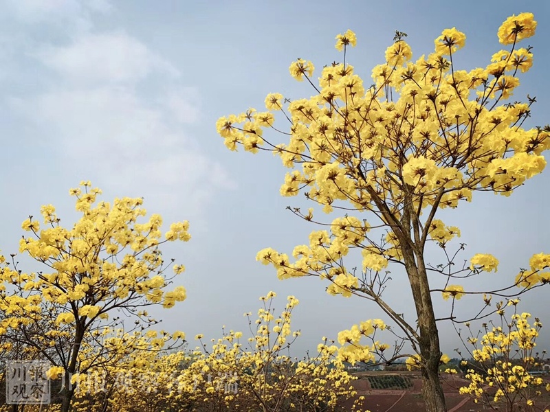3月26日,内江市资中县明心寺镇宜古寺村的一片黄花风铃木苗木林中,三月的蓝天白云下,金黄的花朵挂满树枝,一树就成一景。一群游客正在花树丛恣意的凹造型、摆姿势,有美景美花相衬,往来游人们的笑容也更显绚烂。