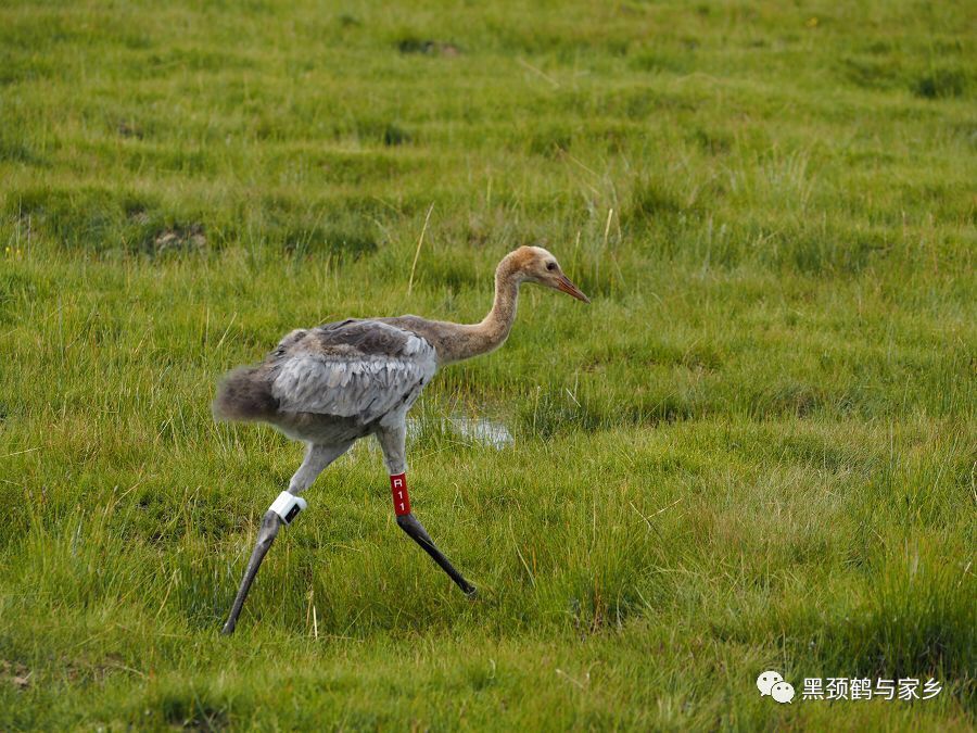 环志后释放的幼鹤,右腿佩戴红色彩环,“R”代表“若尔盖”。李凤山 摄