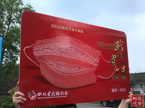 该卡片正面为红色,象征着火锅这道四川特色美食,中间由1400多个医护人员姓名组成了一个白色口罩的形状,象征着白衣天使们对健康的守护。