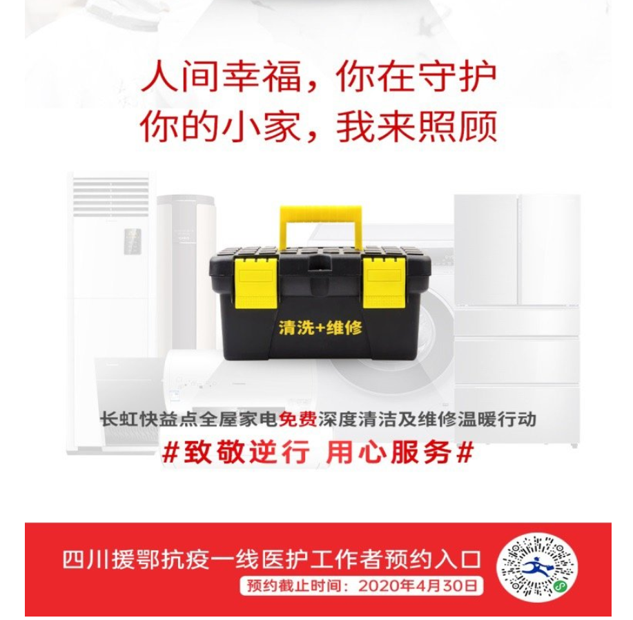为四川援助湖北医护人员免费深度清洗保养空调、家用中央空调、冰箱、洗衣机、抽油烟机、电热水器等全屋家电,不限品牌,免费服务将持续至年底。详情点击>>>