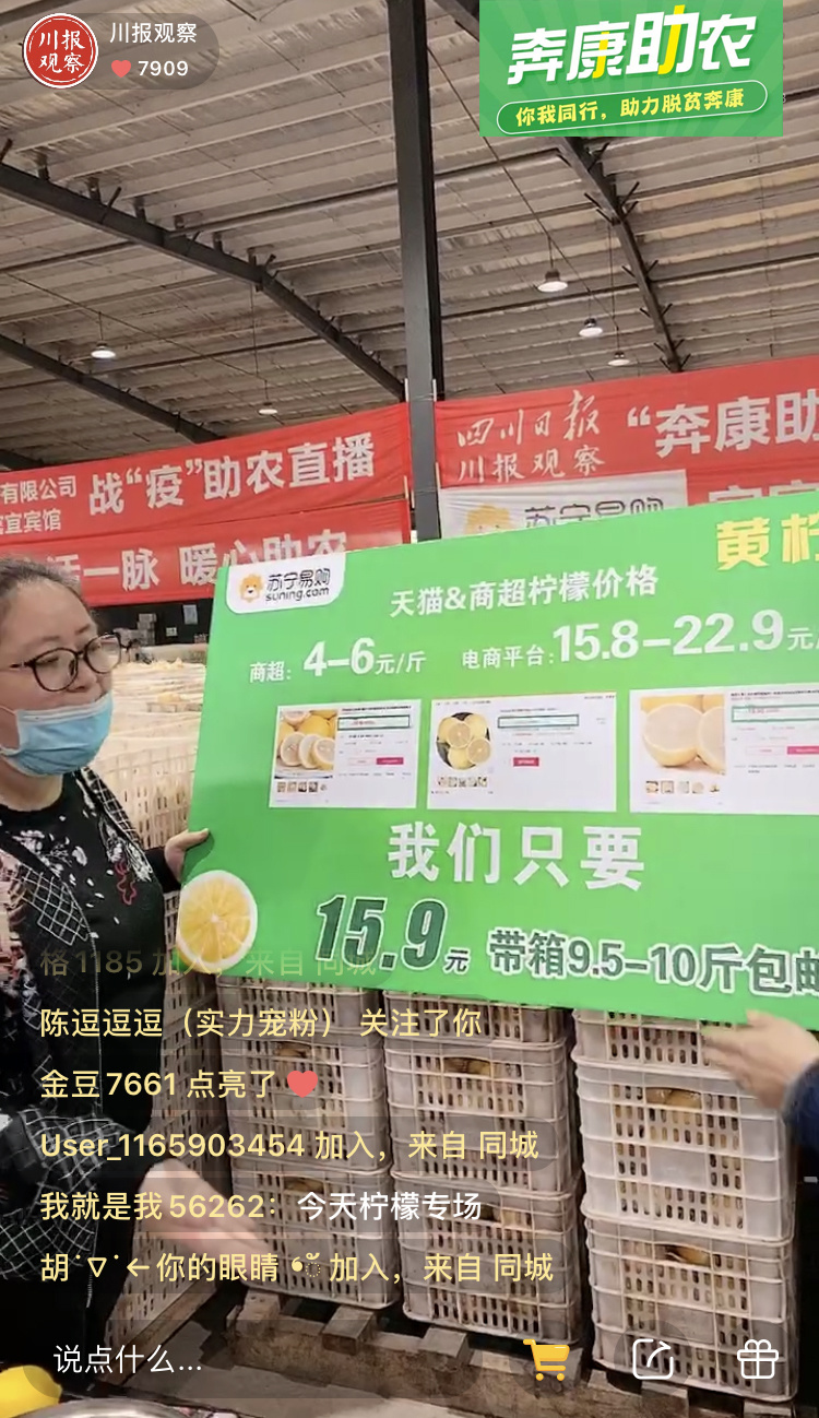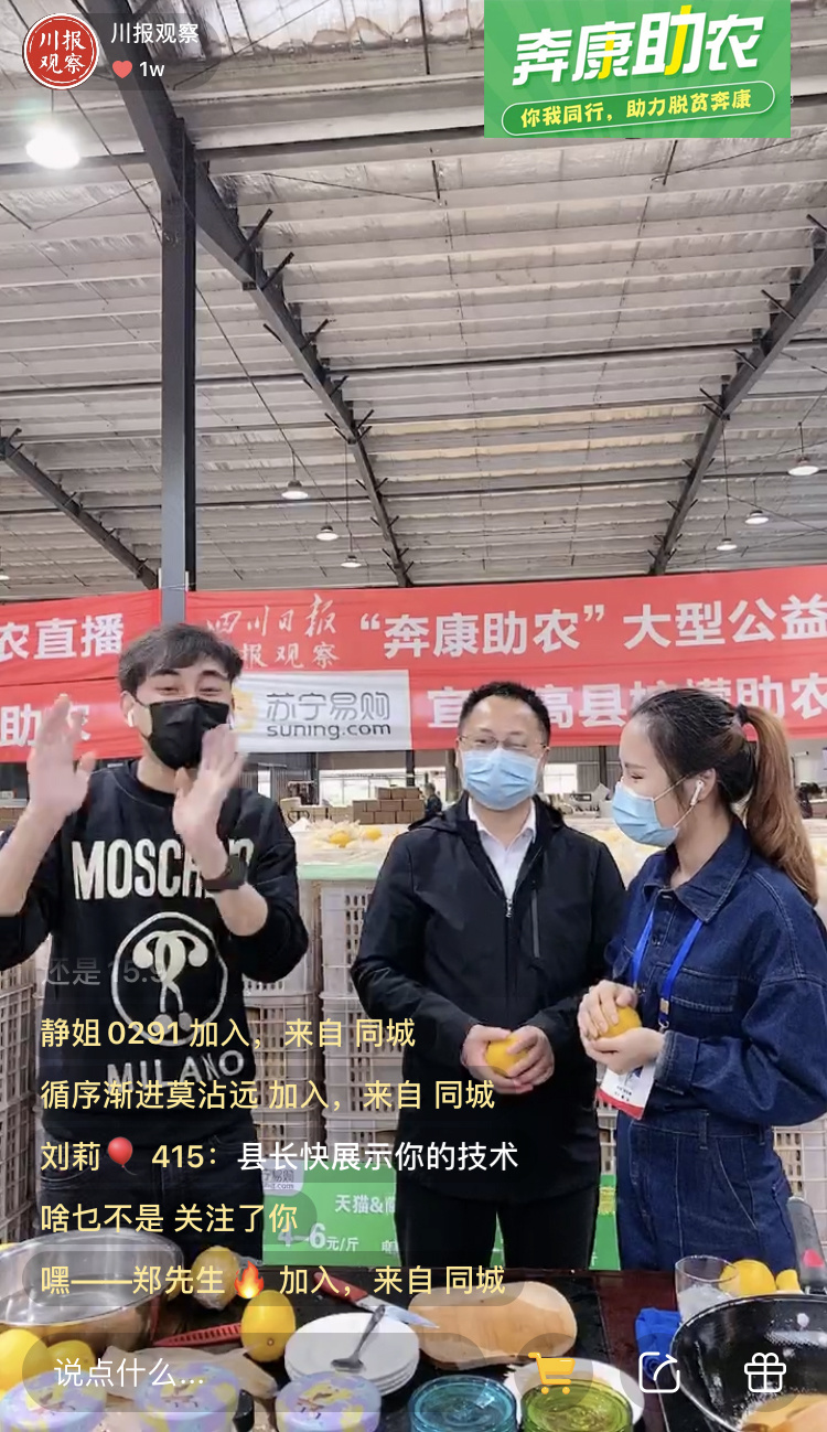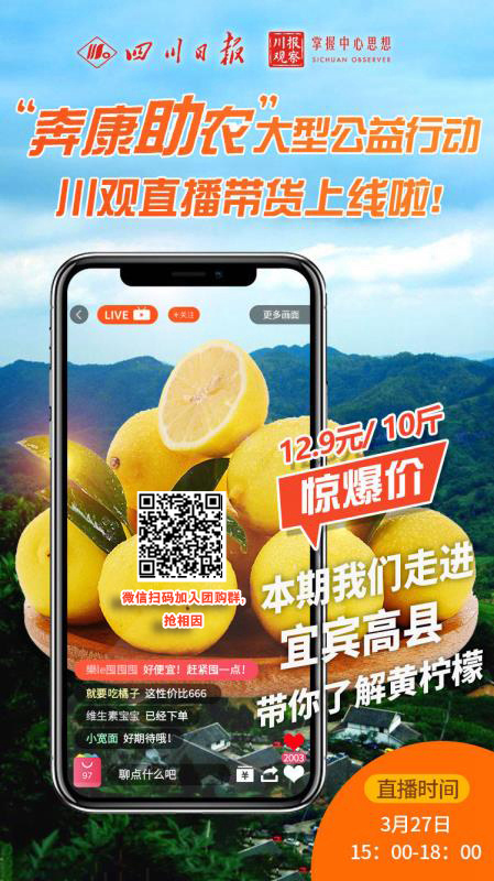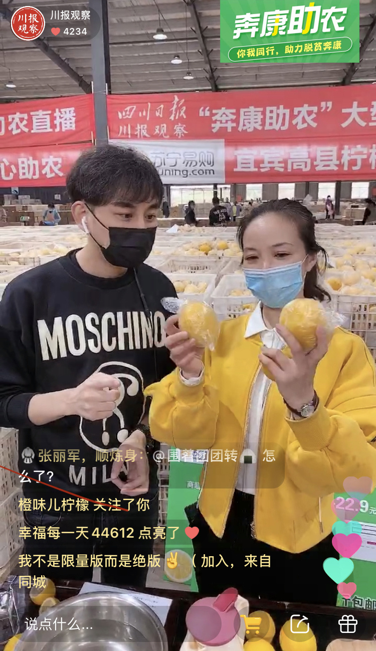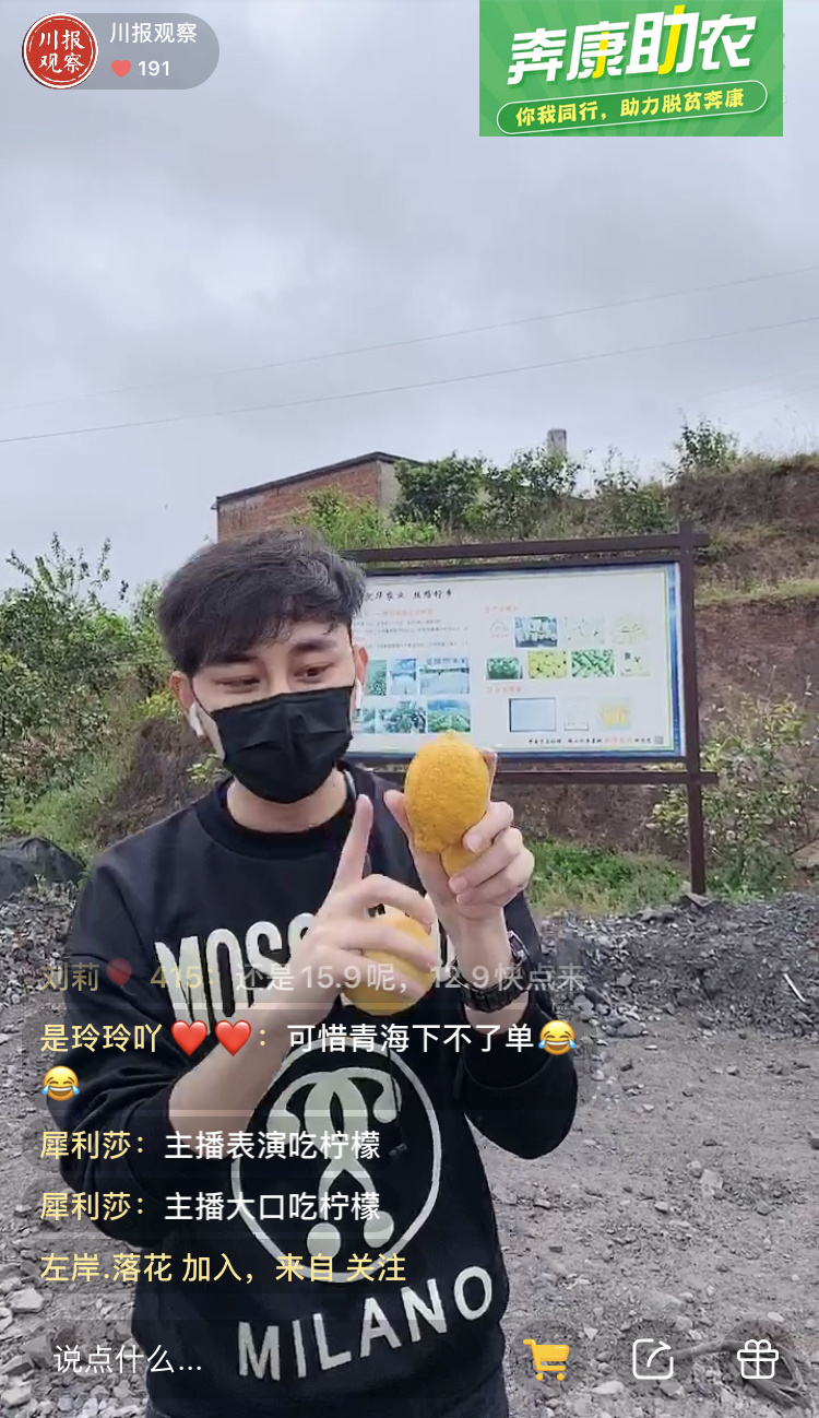 为帮助农民伯伯解决农产品滞销问题,今天15:00-18:00,川报观察联合苏宁易购、快手,走进原产地,在宜宾高县开展了一次直播卖柠檬活动!