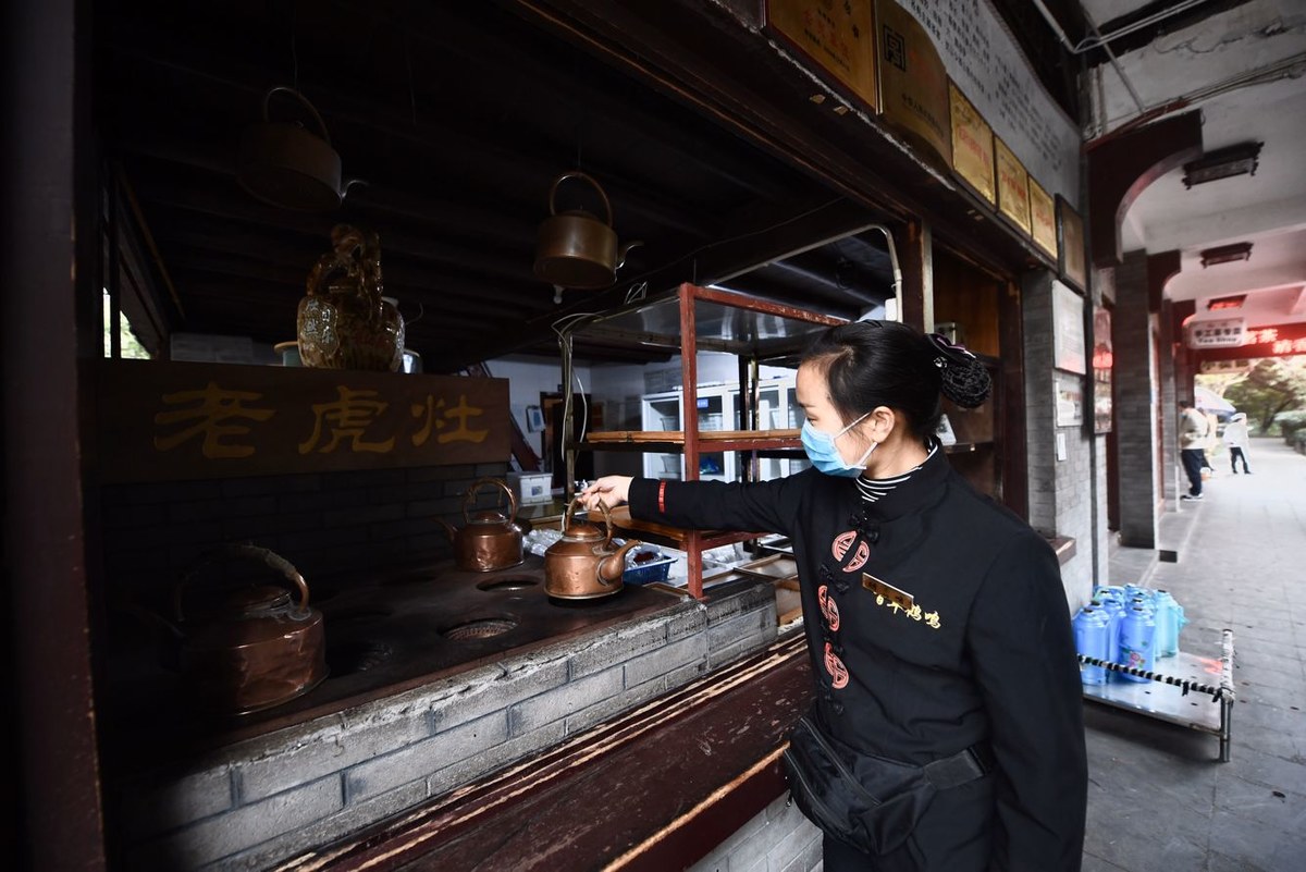 目前,鹤鸣茶社只开放了一半区域,桌与桌间的距离也有所加大。进场的每位茶客都需要戴口罩、测体温。