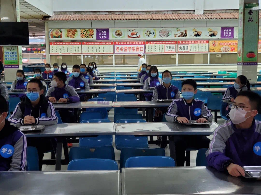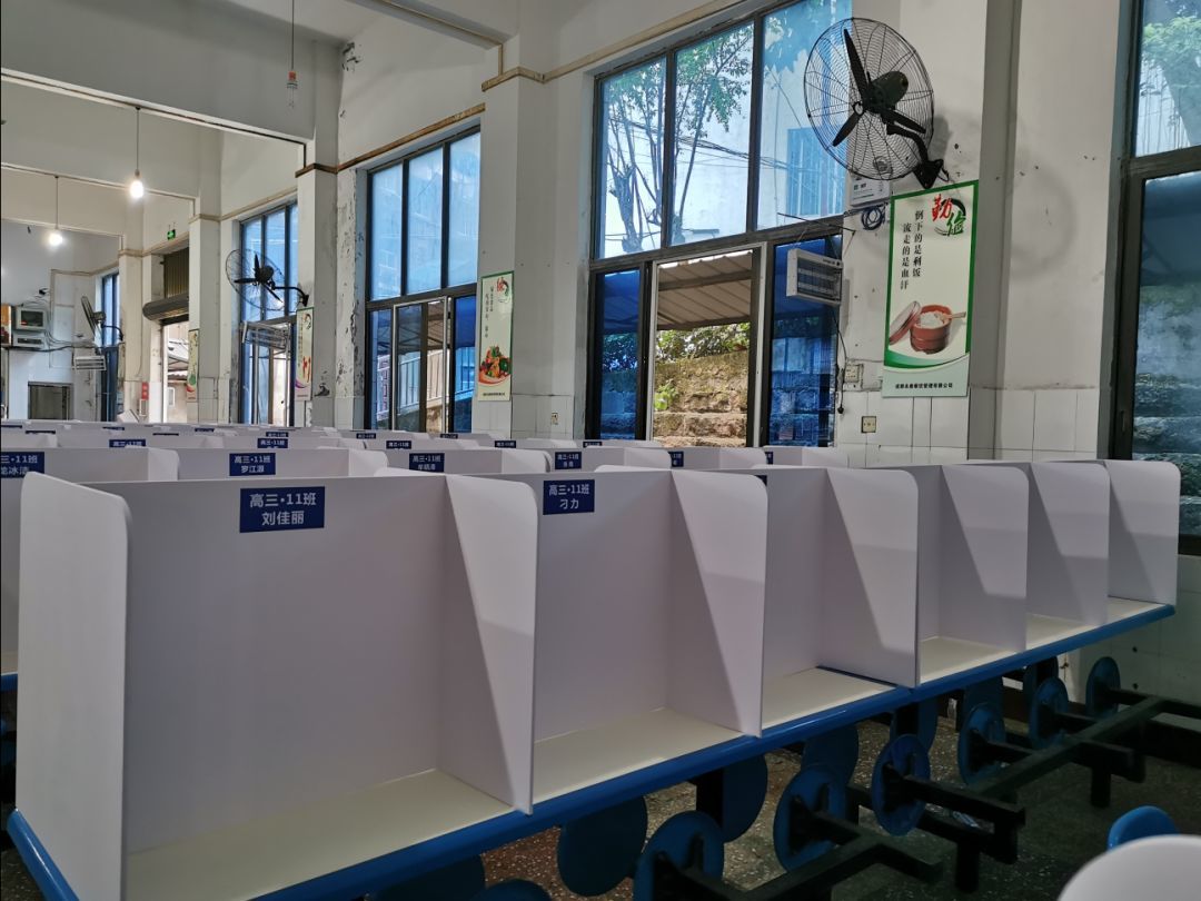 在南充高中,食堂外设置日常防疫检查点,对就餐学生进行逐一测温检查,学生要分批次错峰有序进入食堂,取餐后依次到餐桌单侧入座,相邻两人间隔一个座位就餐。