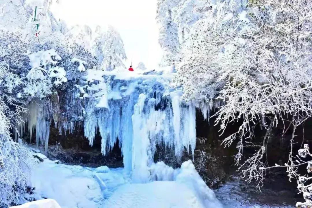 除此之外,游客还将在山顶的兰溪冰瀑,感受大自然的鬼斧神工。在冬季,兰溪瀑布凝结为巨大的冰瀑,将“飞流直下三千尺,疑是银河落九天”诠释得淋漓尽致。在这里,你可以从挂满冰柱的岩嵌里缓缓走过,邂逅冰雪奇缘。