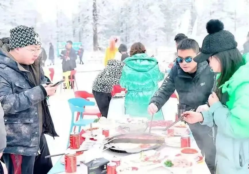 在鸳鸯池,可以吃一顿雪地火锅,感受冰雪里的热辣;