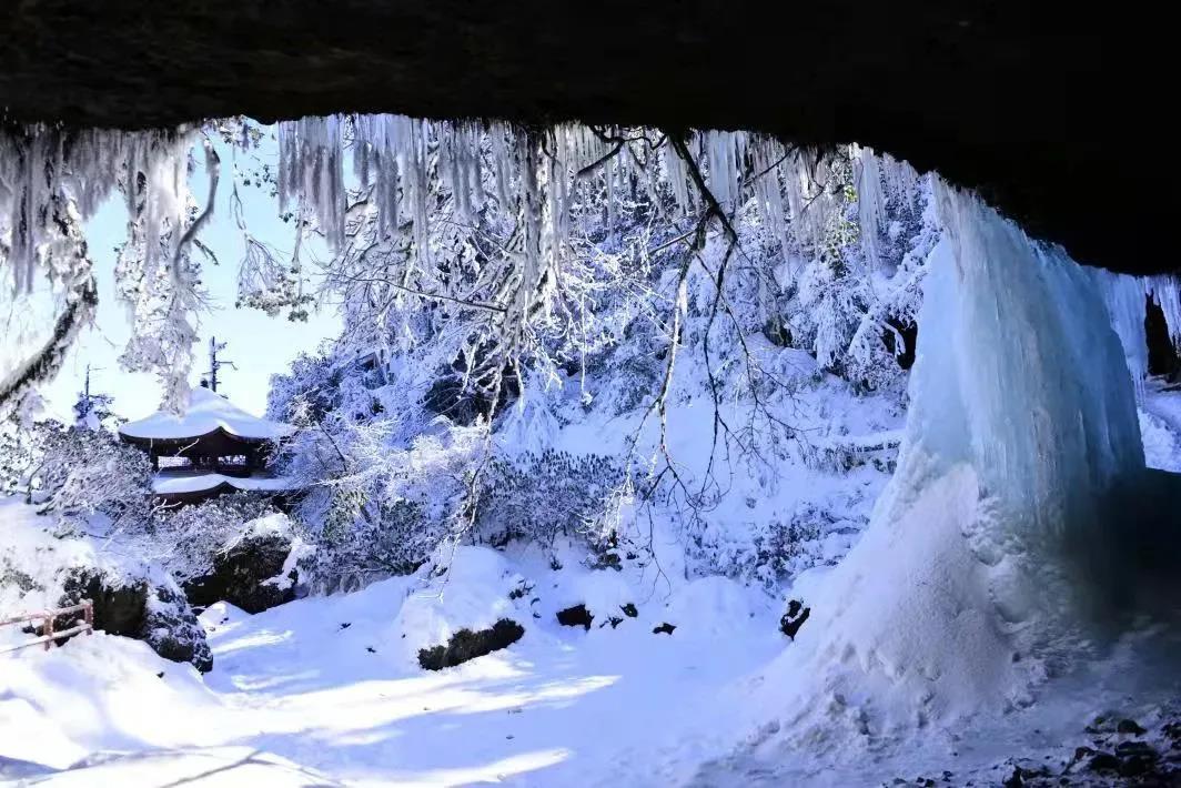 而在诸多美景中,唯有瓦屋冰雪,独享“南国一绝”的赞誉。苏轼有诗云:“瓦屋寒堆春后雪,峨眉翠扫雨余天”,诠释瓦屋山的雪期长达半年之久,横跨春、冬两季。冰瀑、冰帘、雪凇、雾凇随处可见,兰溪瀑布凝结成为巨大的冰瀑,蔚蓝剔透。