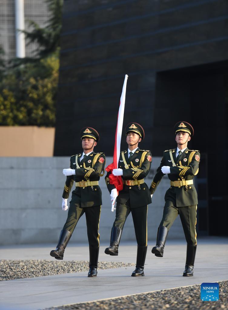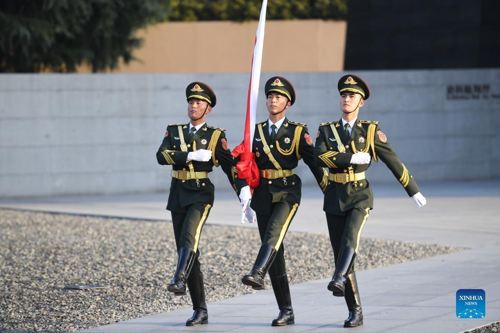 The honor guard escorts the national flag ahead of the national memorial ceremony for the Nanjing Massacre victims at the Memorial Hall of the Victims of the Nanjing Massacre by Japanese Invaders in Nanjing, capital of east China's Jiangsu Province, Dec. 13, 2021. (Xinhua/Ji Chunpeng)