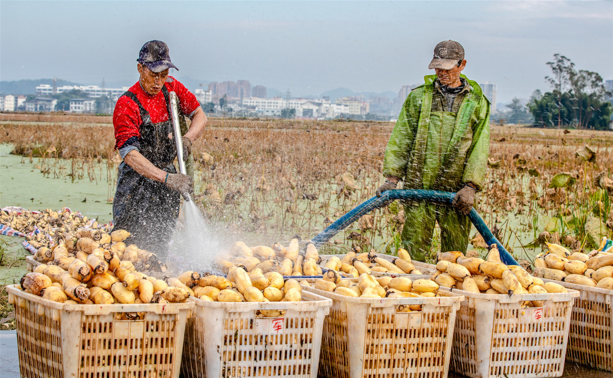 一支是采藕工人。开江县农业农村局相关负责人介绍,“莲花世界”种植食用藕2000亩,产量稳定在200万公斤。在采藕高峰期,由本地农民工+周边县市专业挖藕工人组成的采藕队伍,开进“莲花世界”,将淤泥中“熟睡”的莲藕挖出,清洗干净。