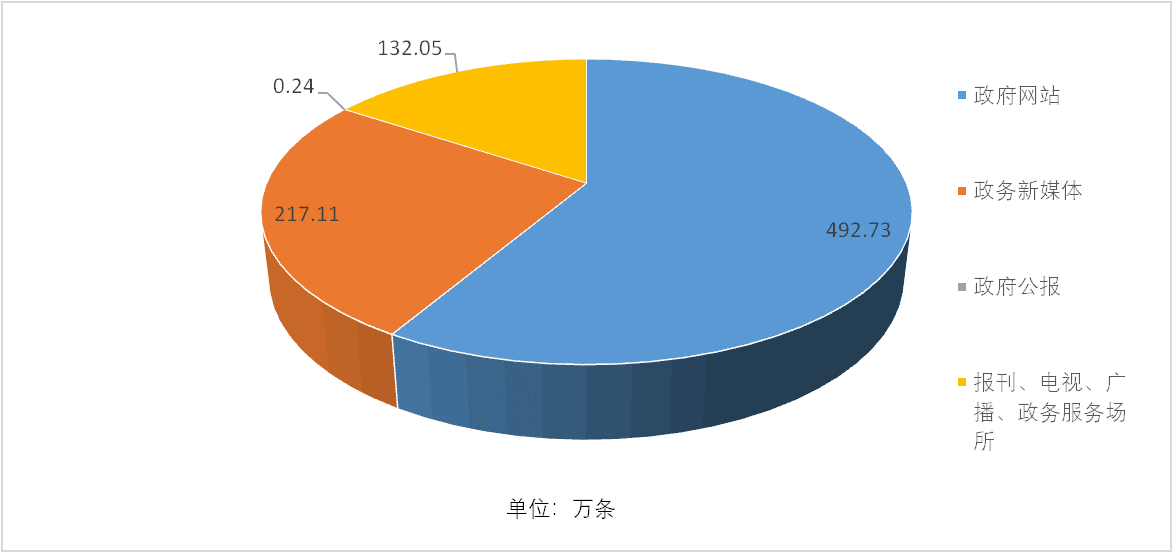 从公开渠道来看,政府网站占了“半壁江山”,公开信息492.73万条,占比58.51%;政务新媒体公开信息217.11万条,占比25.78%;全省政府公报刊登政府规章和规范性文件等信息0.24万条,占比0.03%;通过报刊、电视、广播、政务服务场所等其他渠道公开信息132.05万条,占比15.68%。
