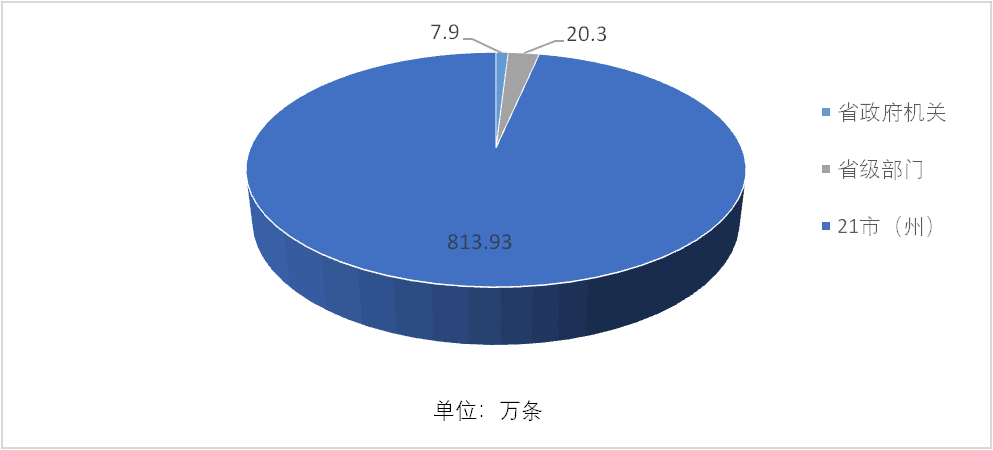 从公开主体来看,以市(州)为主。省政府机关公开7.9万条,占比0.94%;省直部门公开20.30万条,占比2.41%;21个市(州)公开813.93万条,占比96.65%。