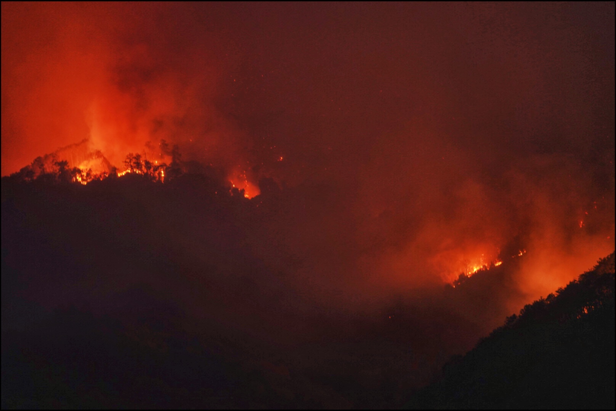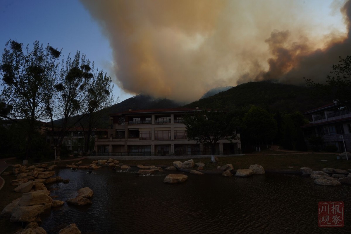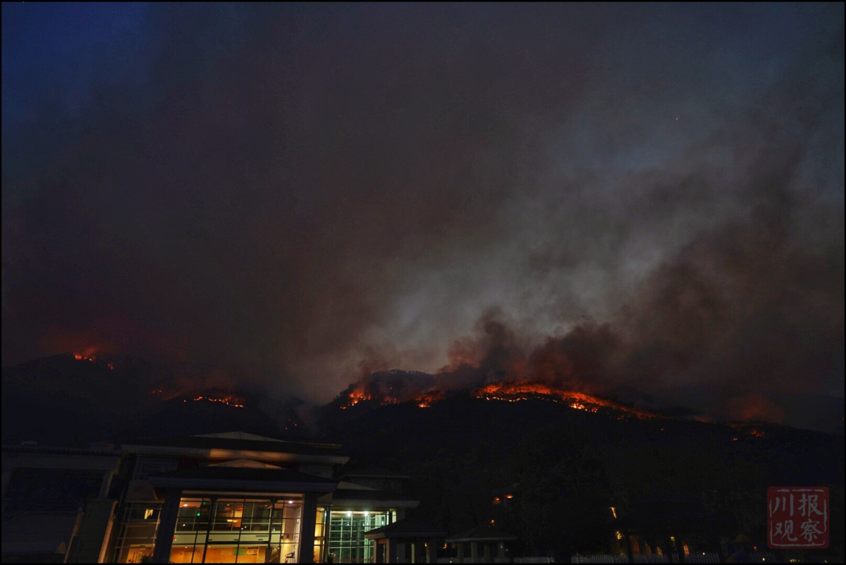 晚8时许,西昌市森林火灾火势借风力增大,泸山景区方向火光冲天,浓烟遮盖夜色和星空。