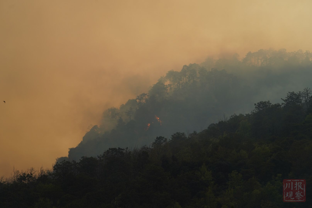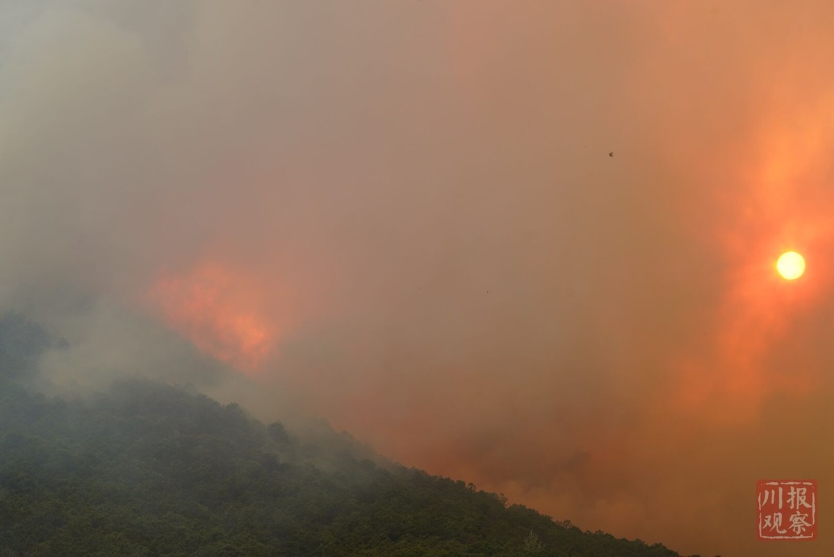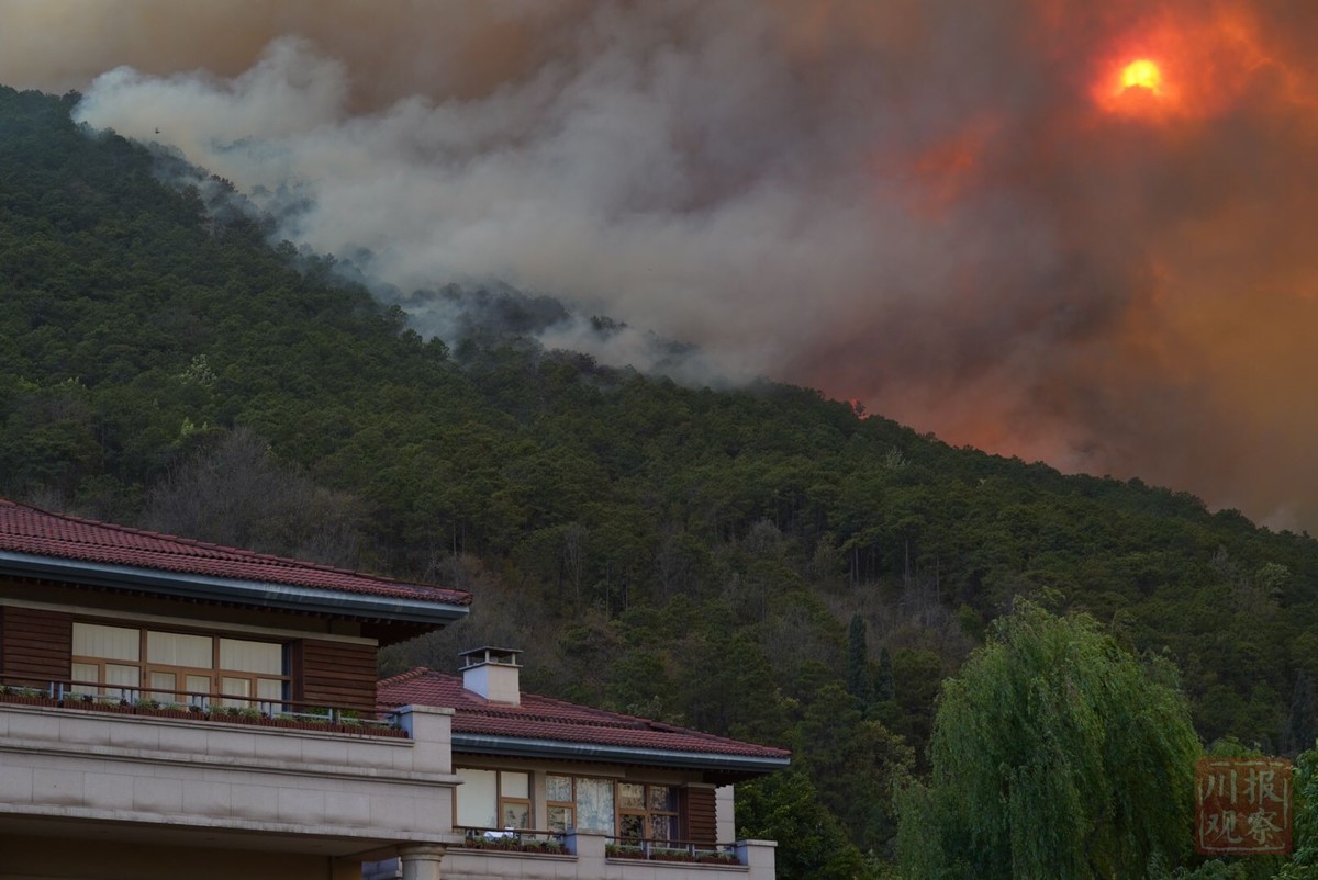 记者在邛海宾馆拍摄点,距离燃火点800米,可以感到炽热的辐射,著名的古刹光福寺也笼罩在浓烟中。