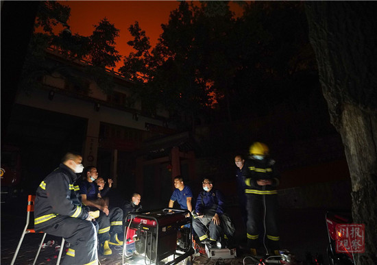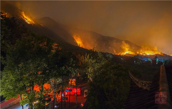 在光福寺,背后泸山上的火光把天空映照得通红。来自成都、德阳、凉山等三地的30余名消防人员在光福寺现场通宵值守,时刻关注着火情进展。据现场消防人员介绍,火线距光福寺大殿有400余米的距离,为保护寺庙安全,消防人员现场布置了3道防线,接通了寺庙内12处消防供水通道,同时,多辆消防车及市政供水车在现场值守。