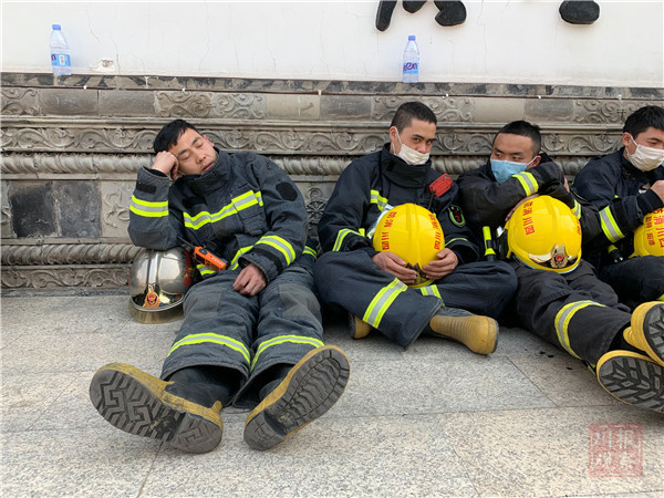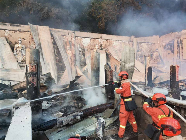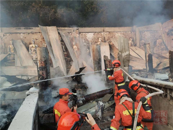 4月1日8时左右,凉山森林消防支队50名指战员在泸山三清观架设水泵打开突破口后向北扑打,对三清观到五祖庵之间的余火烟点进行清理,重点对五祖庵已烧毁的木头进行浇灭,全力保卫五祖庵,防止火势向下蔓延,危及其他寺庙及周边设施。