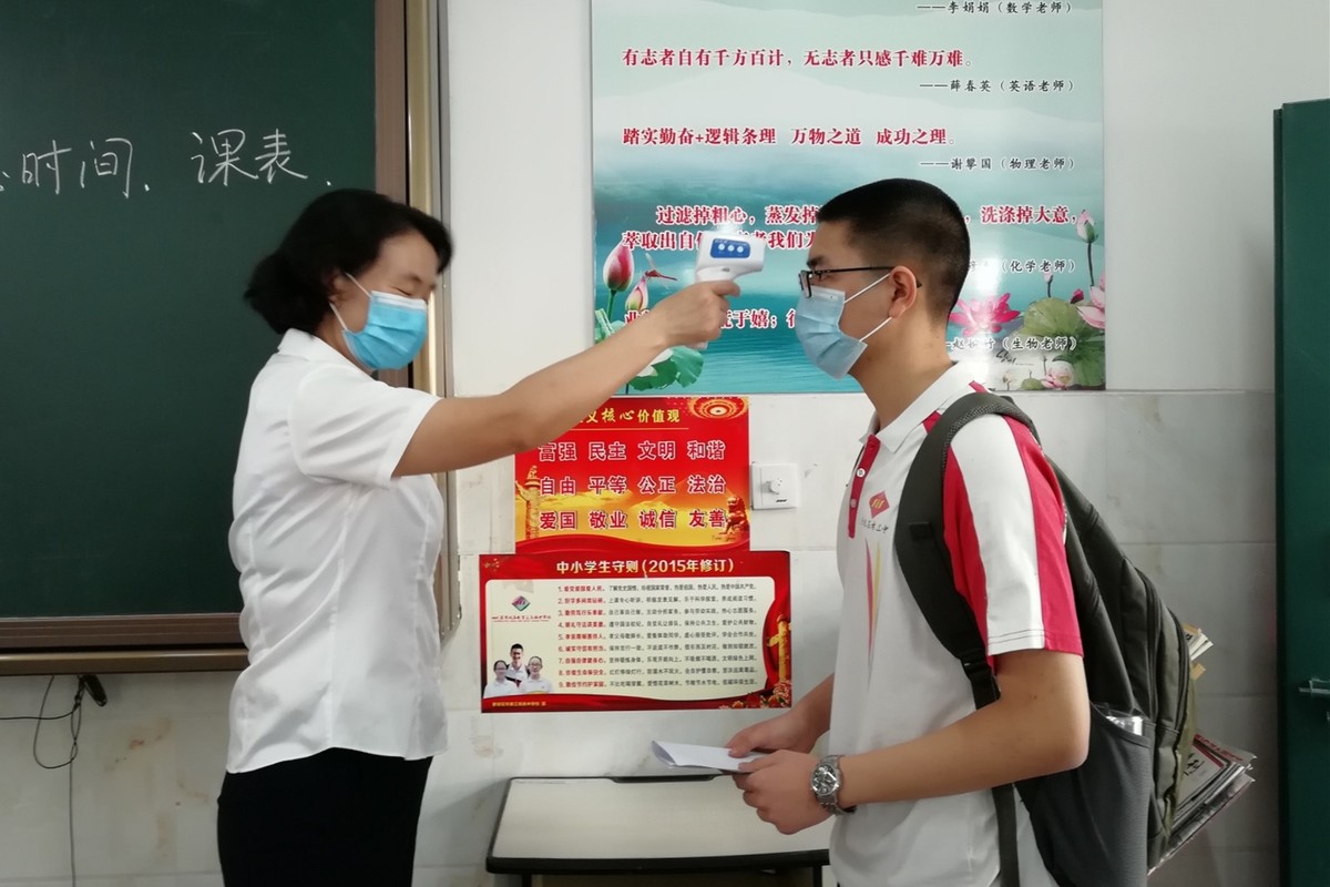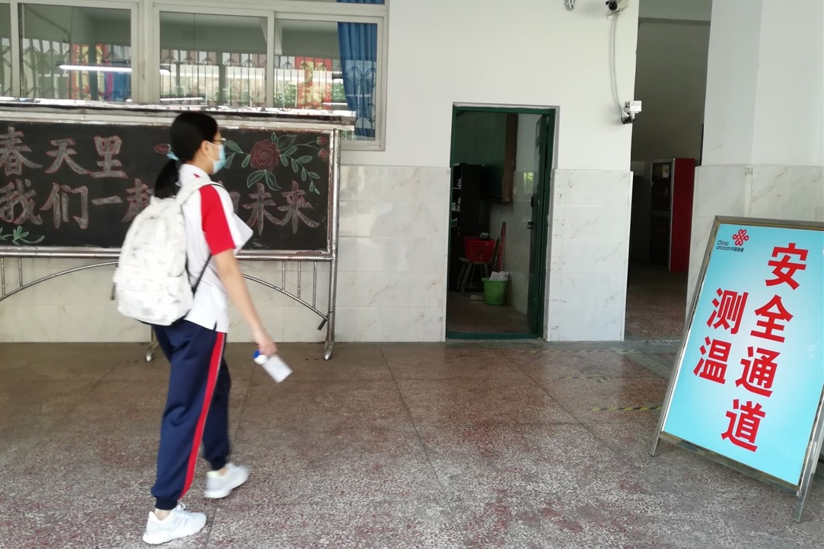当日早上8时许,攀枝花市第三高级中学校门口开始热闹起来。与往年开学不同的是,返校学生佩戴口罩,持《健康卡》、《承诺书》、校牌,经红外线测温仪检测体温正常方可入校,每班学生按各自通道入校,间隔不小于1米。到达教室后,还将由所在班级的班主任再次把关,复检体温,及时登记。