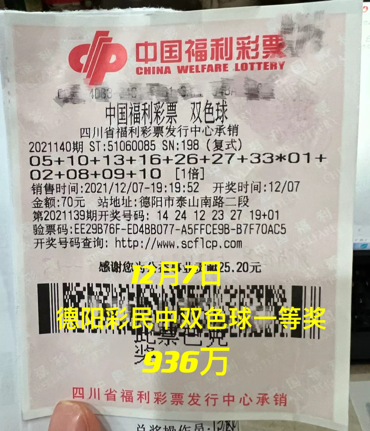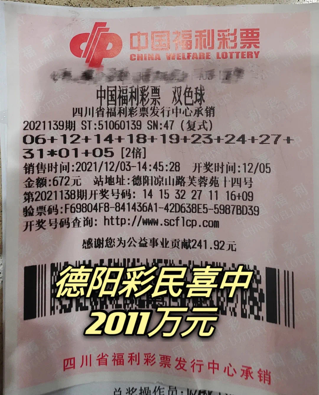 12月5日,双色球第2021139期开奖,四川中得2注,为一张单票金额为672元 “9+2”倍投复式票,德阳一彩民中得巨额奖金2011万余元!