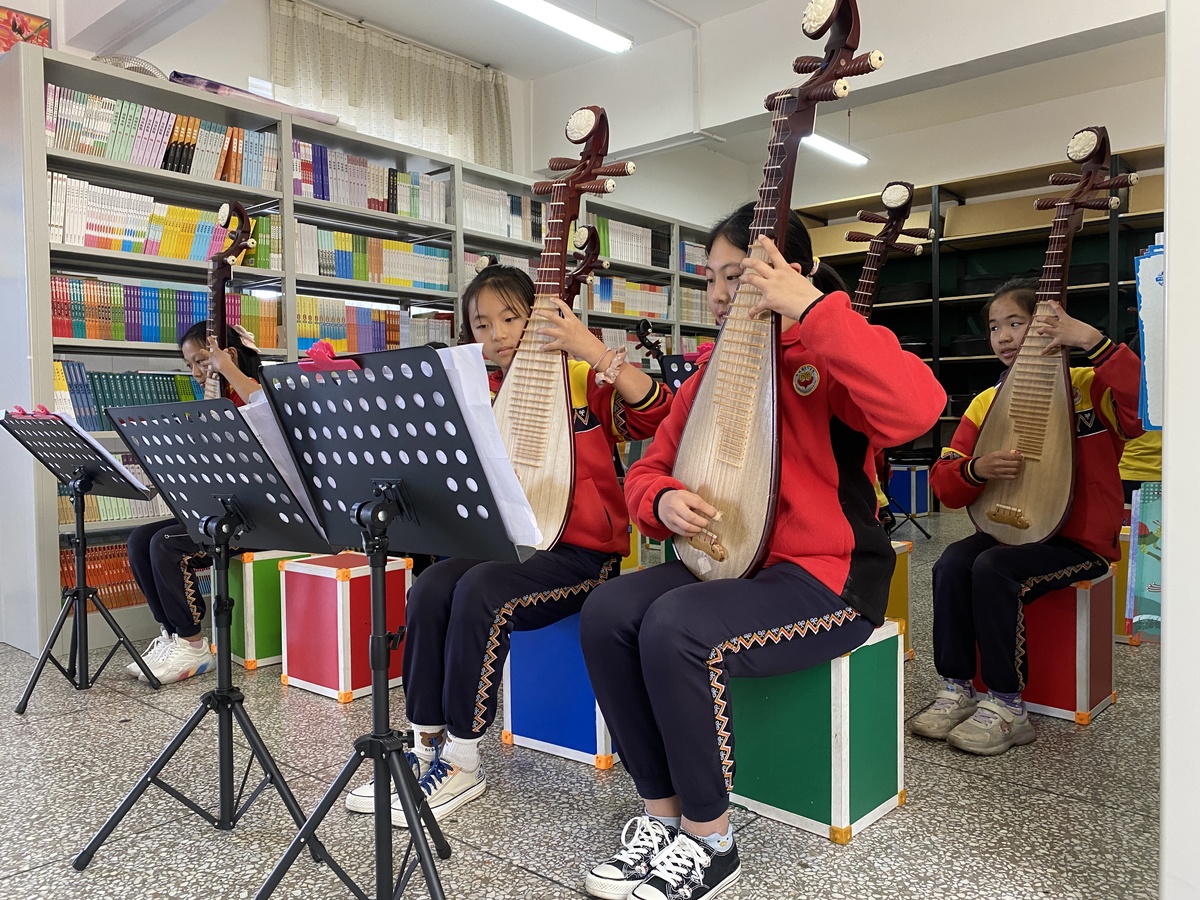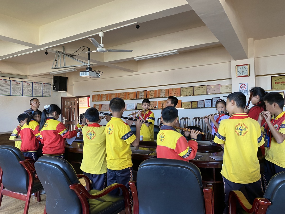 身处边远的少数民族乡镇,学校更加关注地方非物质文化遗产的教育价值,“双减”启动以来,学校推出“每天一节课业辅导+一节课后拓展”,将本地特色的俚濮彝族“谈经古乐”、羊皮鼓舞和传统彝绣融入活动中。